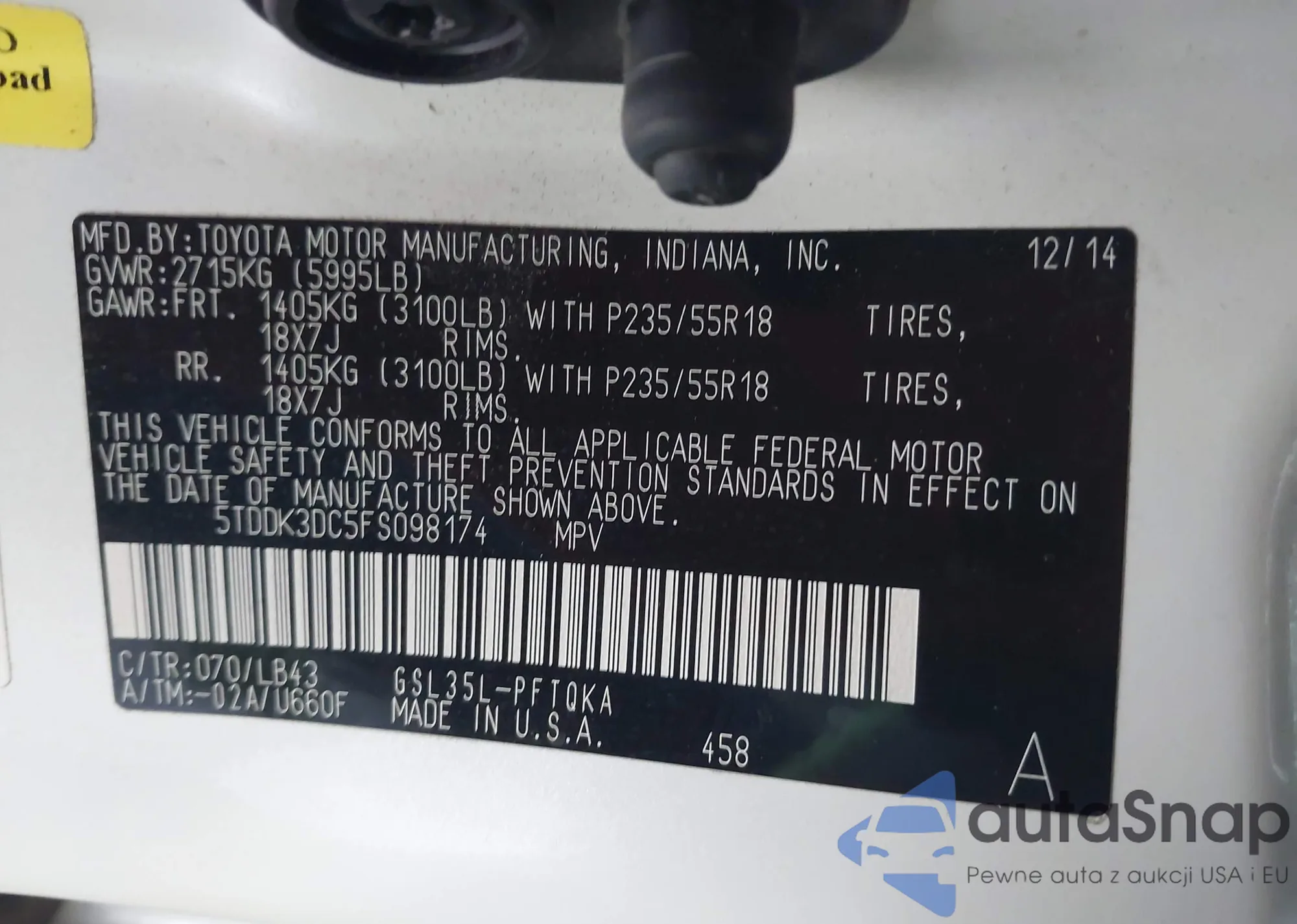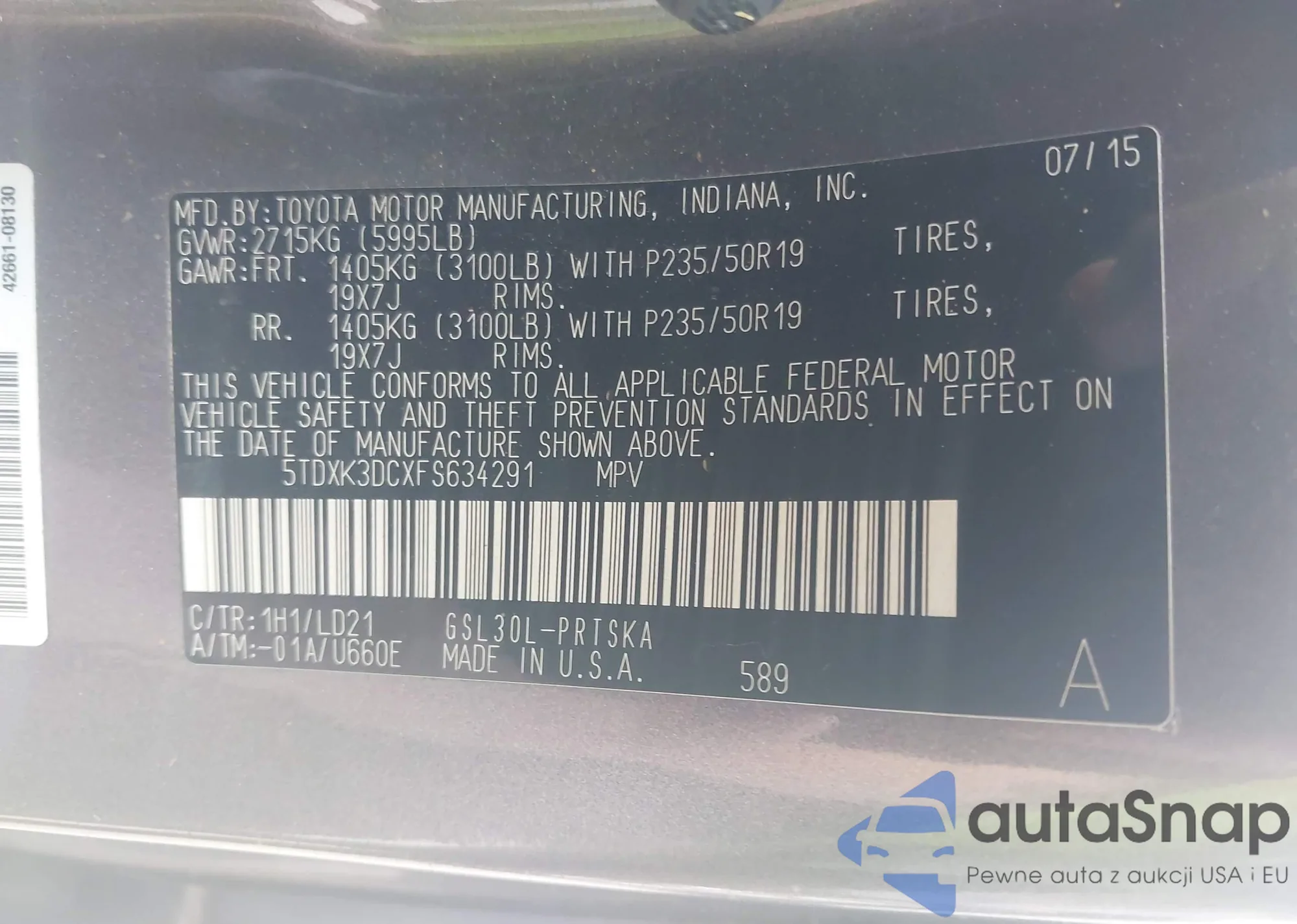 LOT: 42087135 VIN: 5TDYK3DC5FS622991