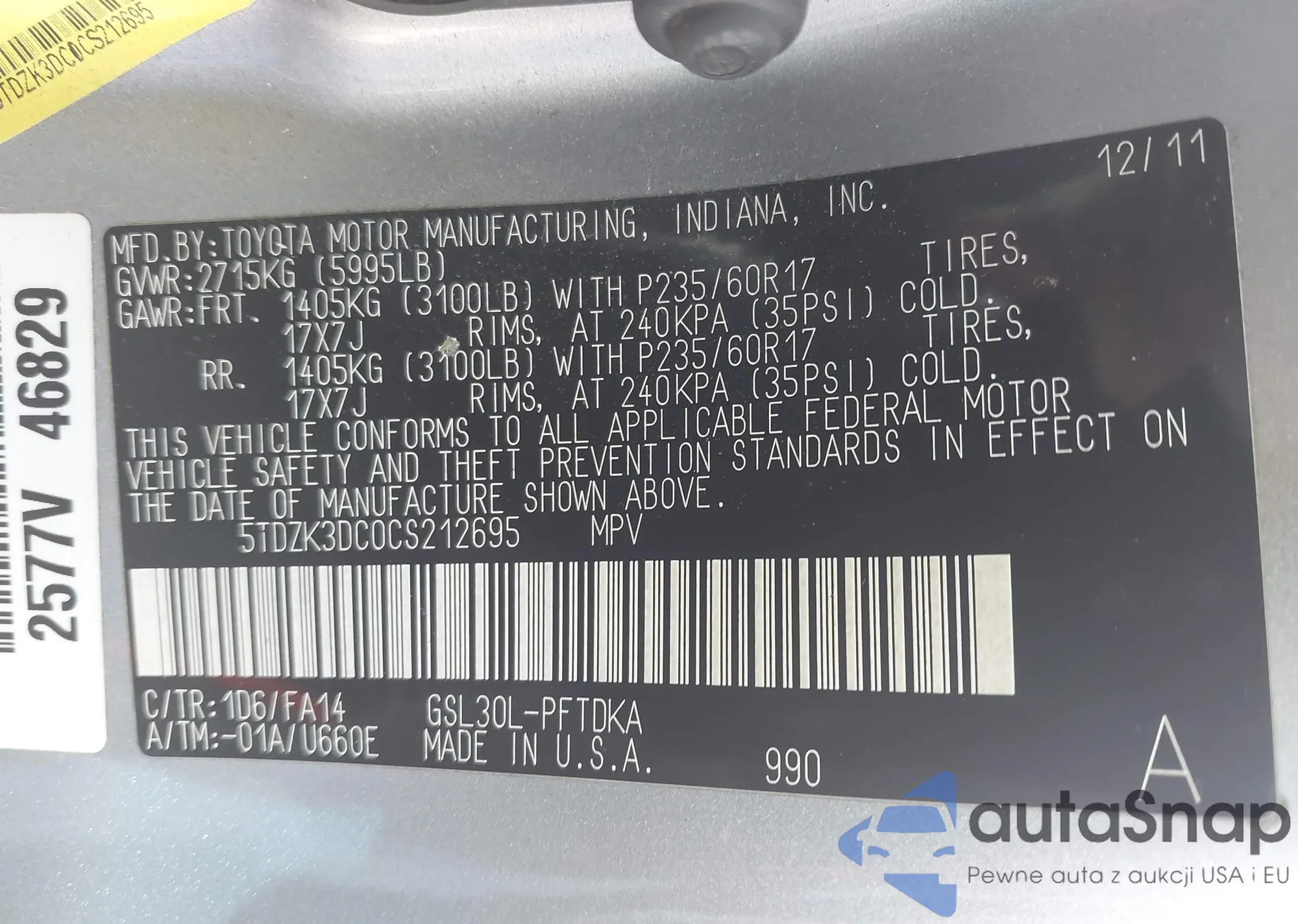 LOT: 43310324 VIN: 5TDZK3DC0CS212695