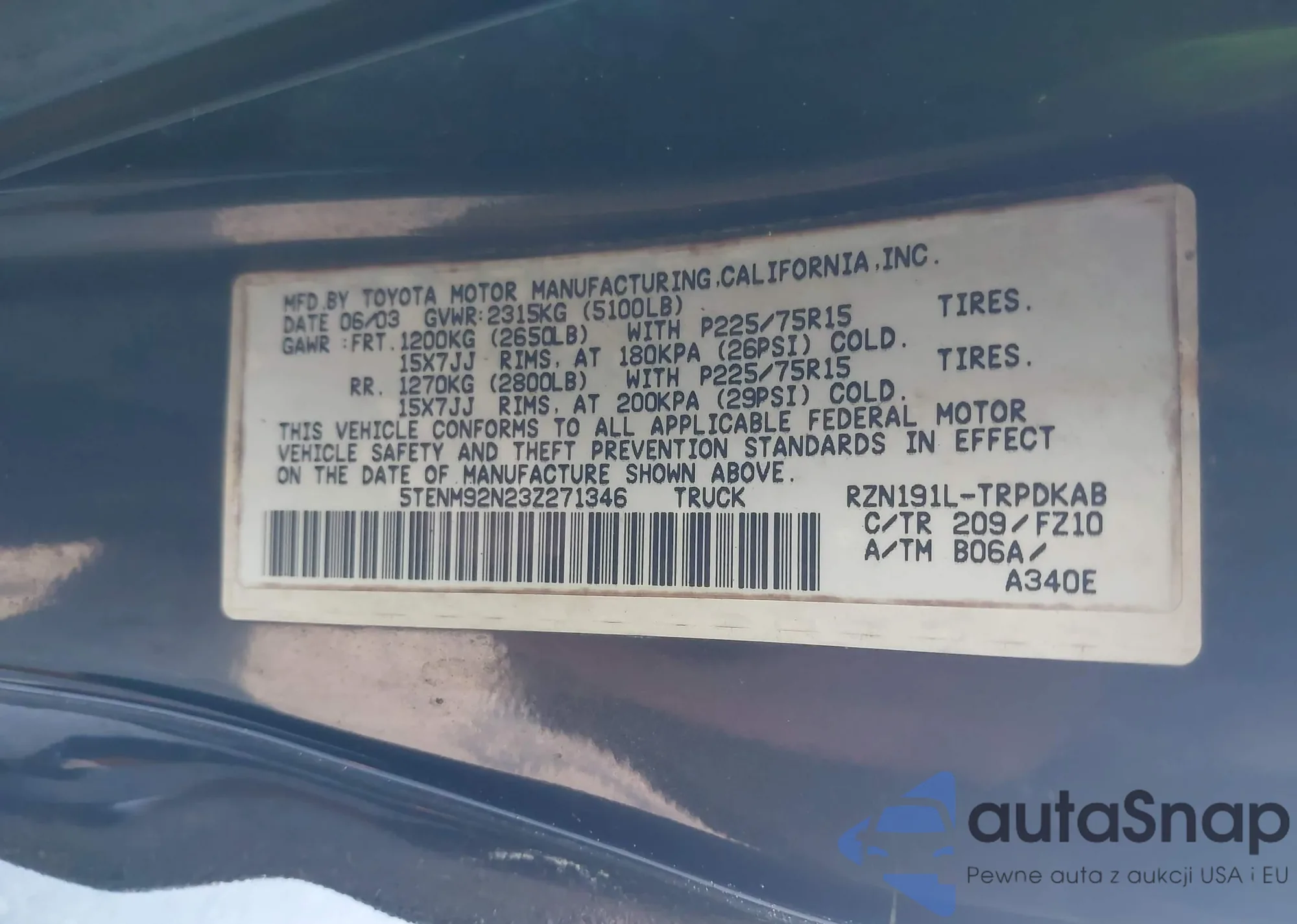 • VIN 5TENM92N23Z271346