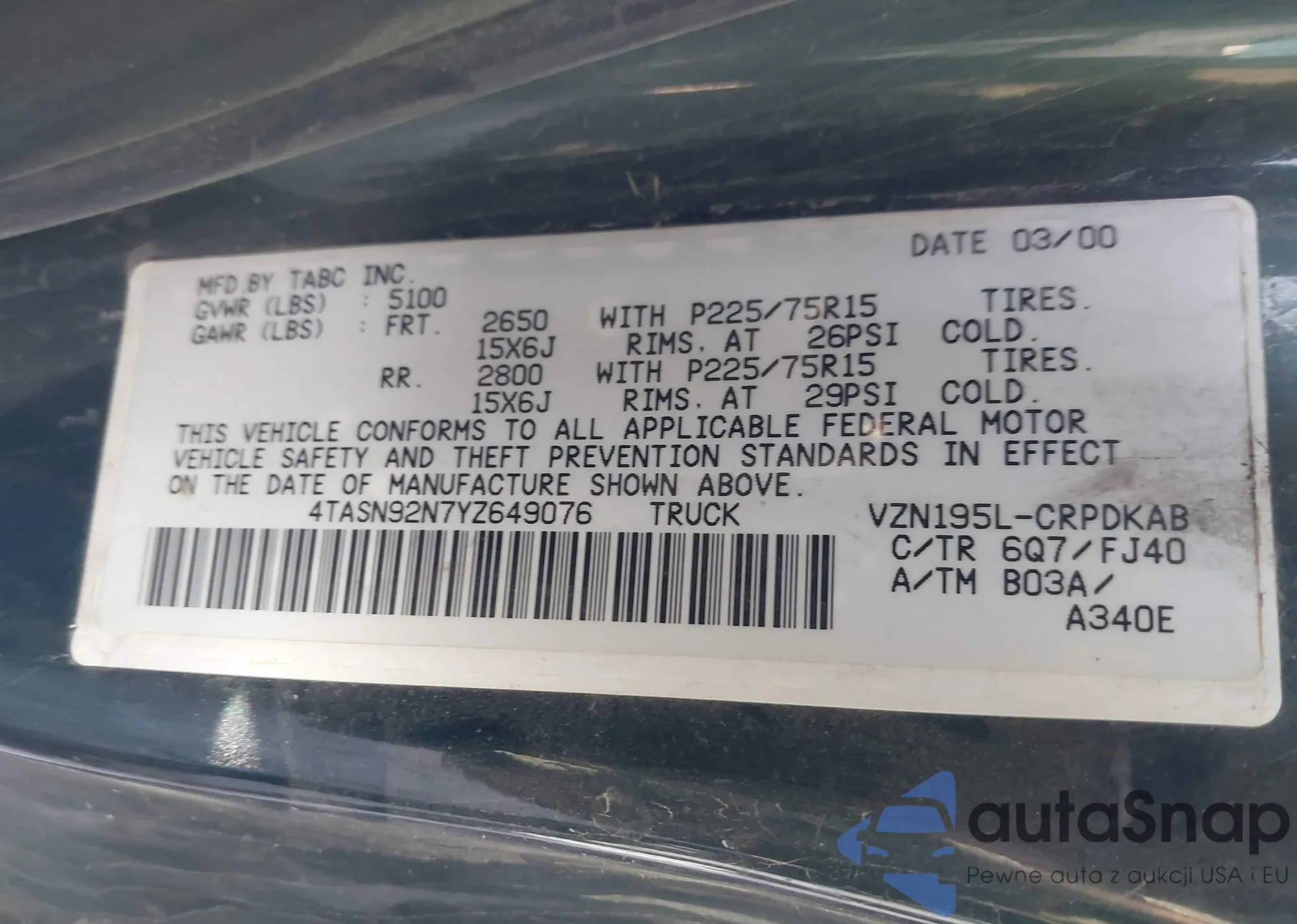 • VIN 4TASN92N7YZ649076