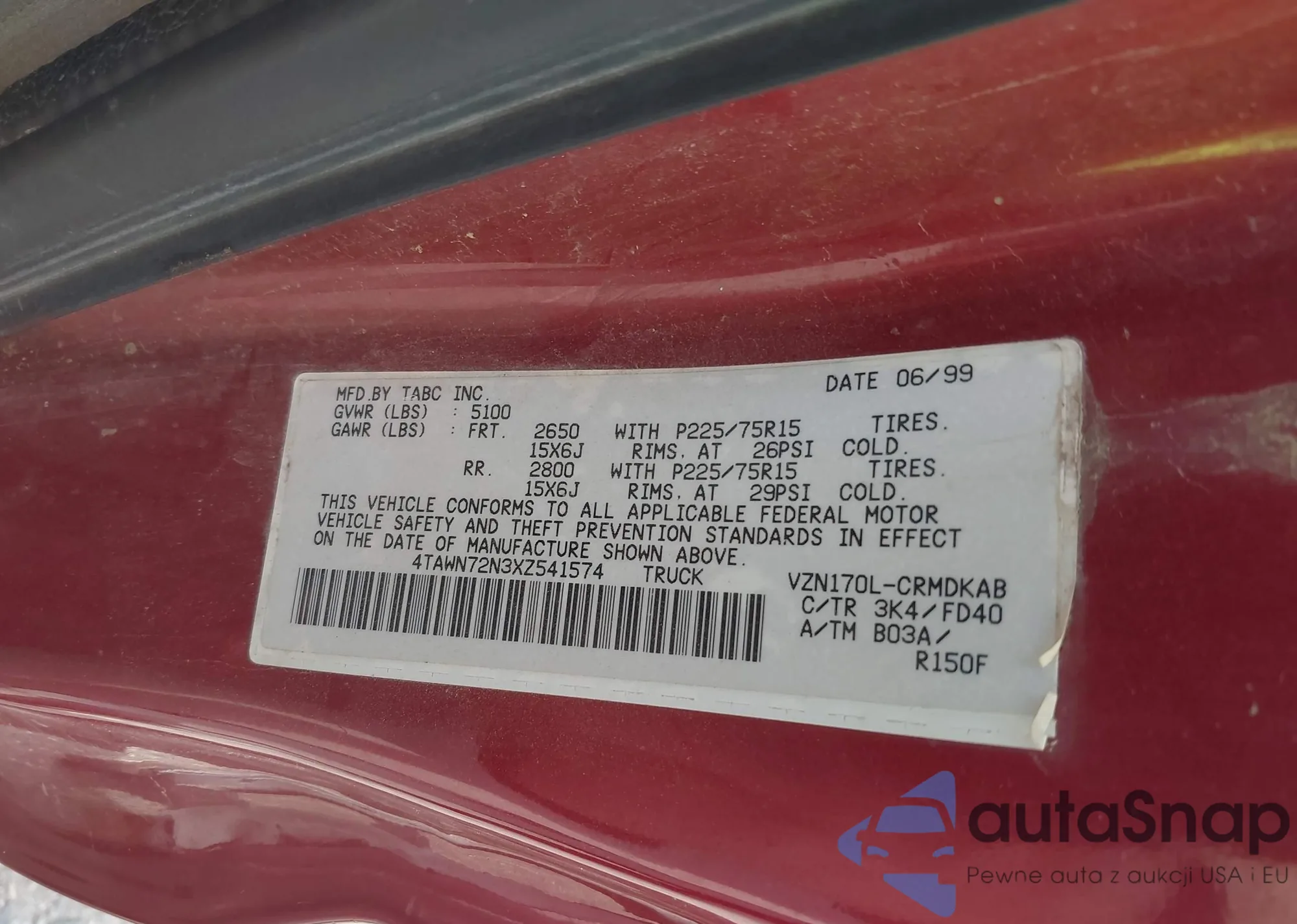 • VIN 4TAWN72N3XZ541574