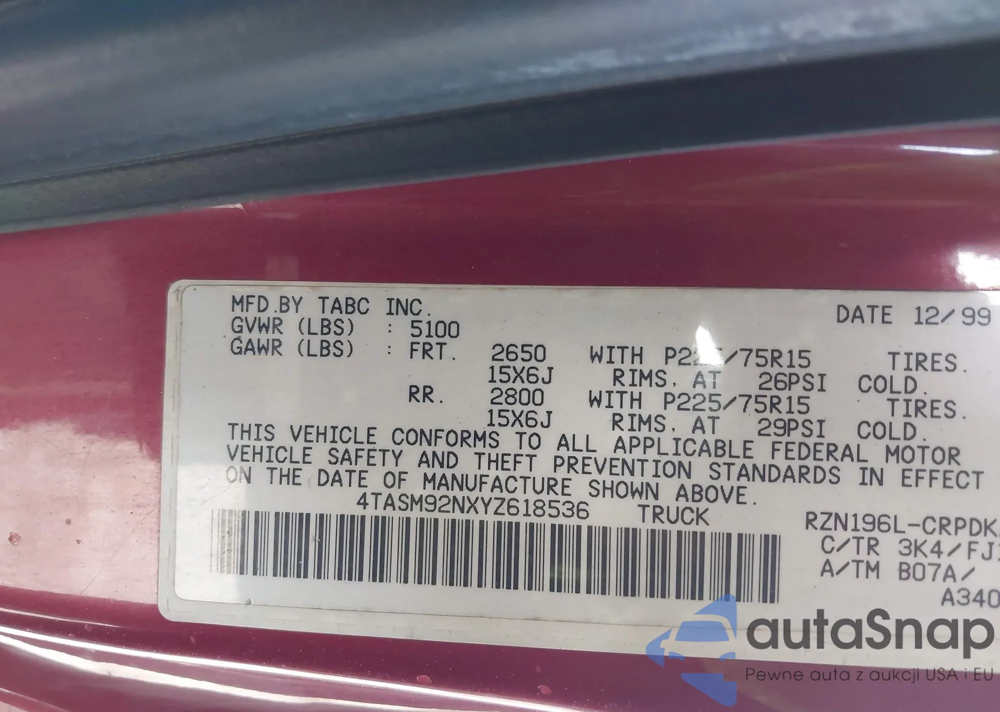 • VIN 4TASM92NXYZ618536
