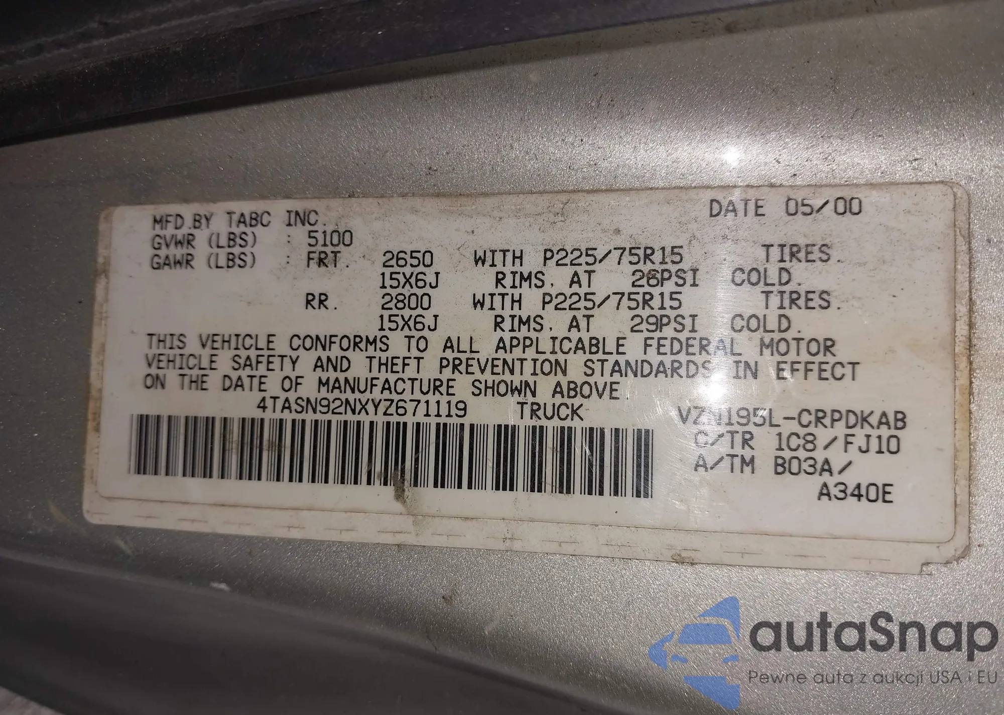 • VIN 4TASN92NXYZ671119