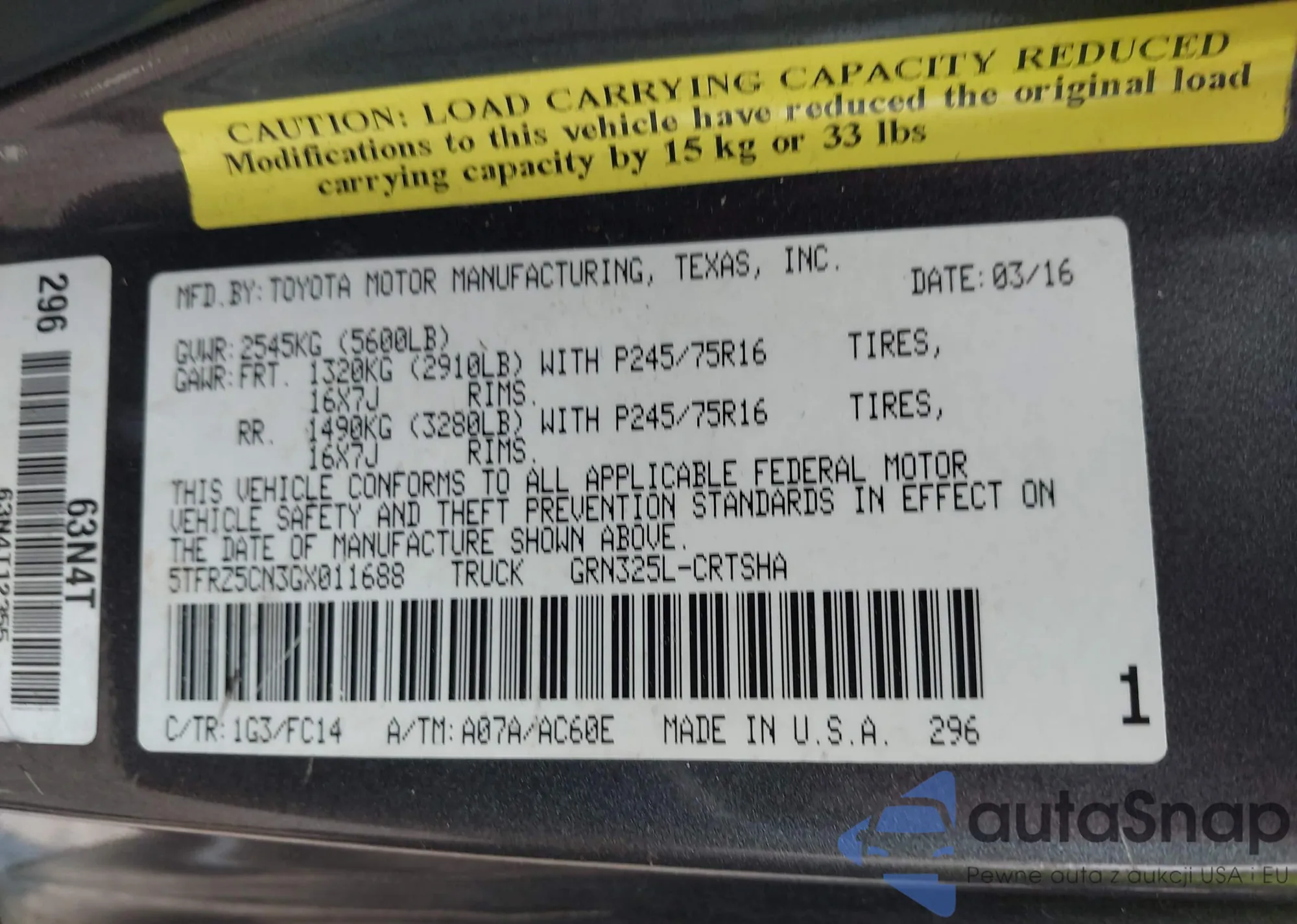 LOT: 44354531 VIN: 5TFRZ5CN3GX011688