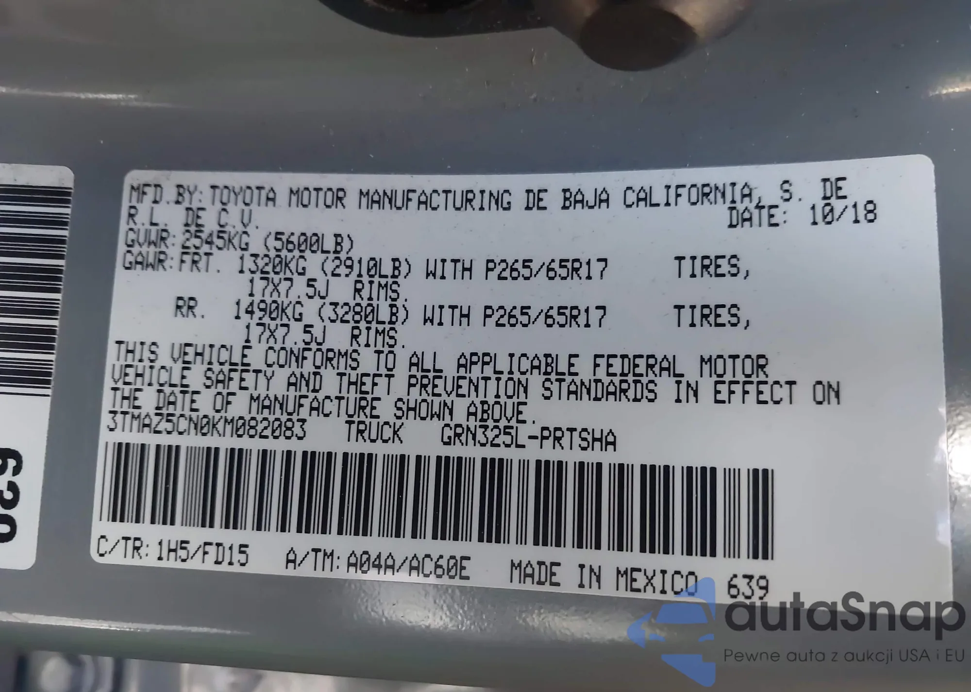 LOT: 44367071 VIN: 3TMAZ5CN0KM082083
