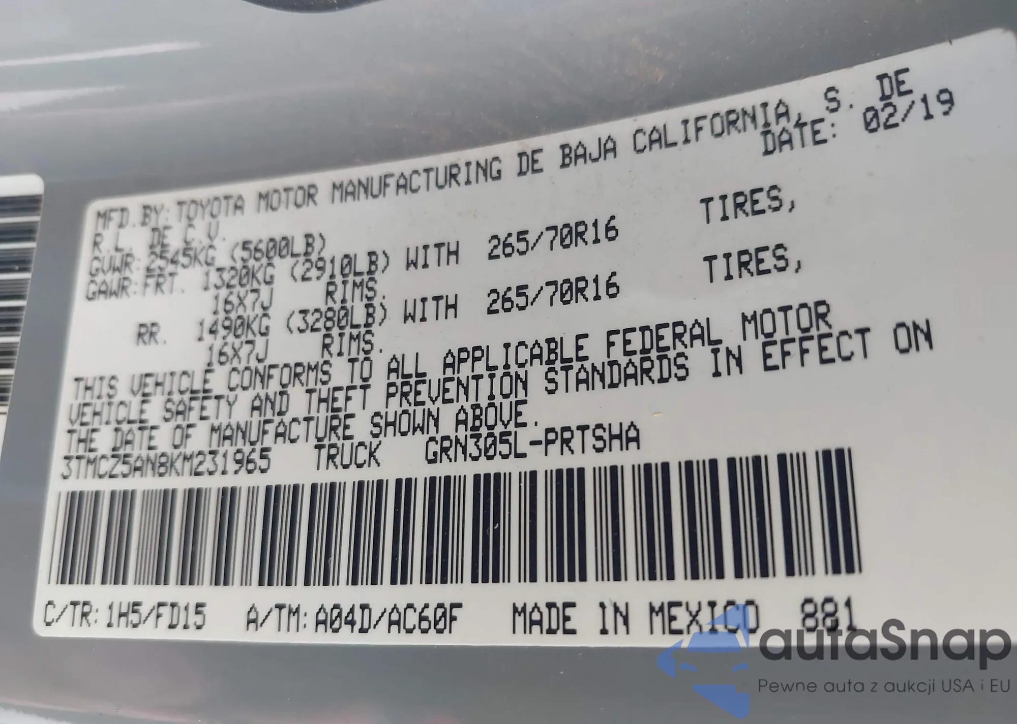 • VIN 3TMCZ5AN8KM231965