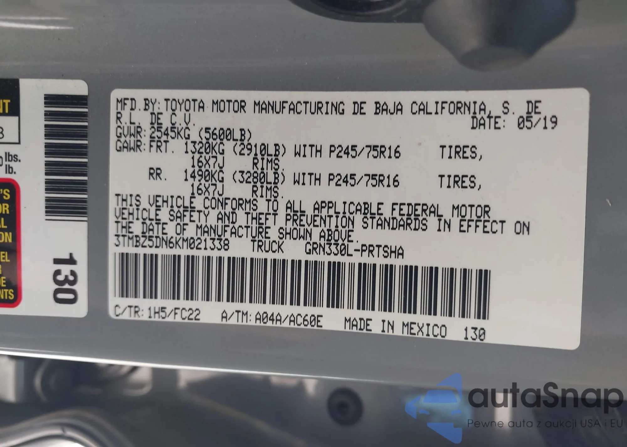 • VIN 3TMBZ5DN6KM021338