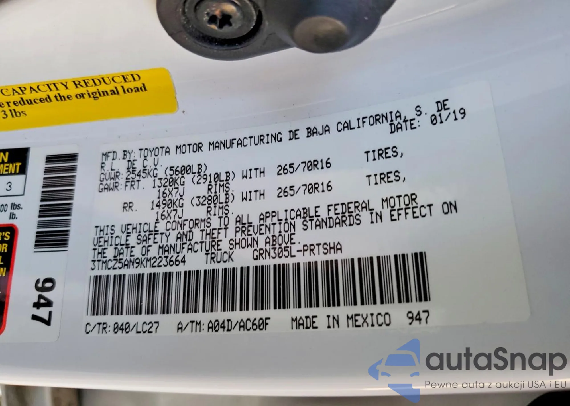 • VIN 3TMCZ5AN9KM223664