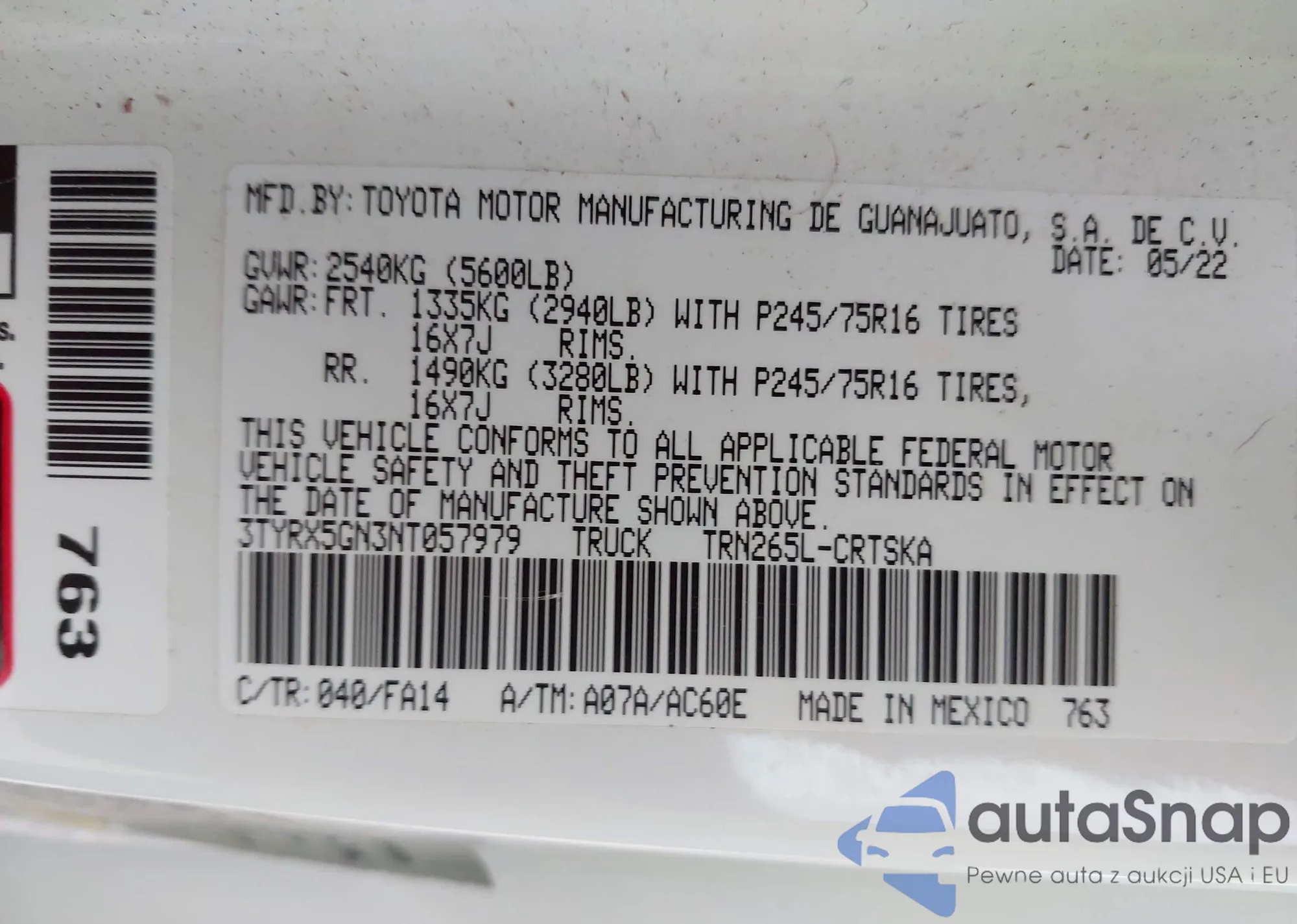 • VIN 3TYRX5GN4NT049678