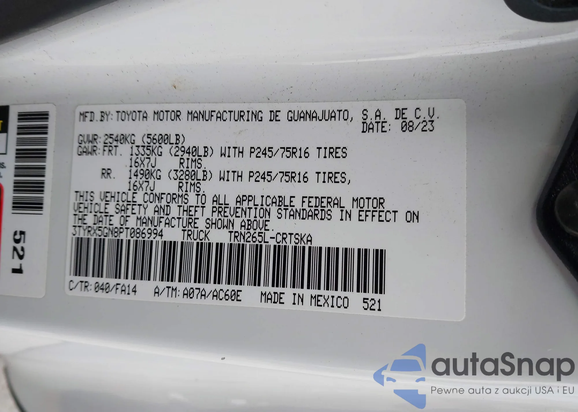• VIN 3TYRX5GN8PT086994