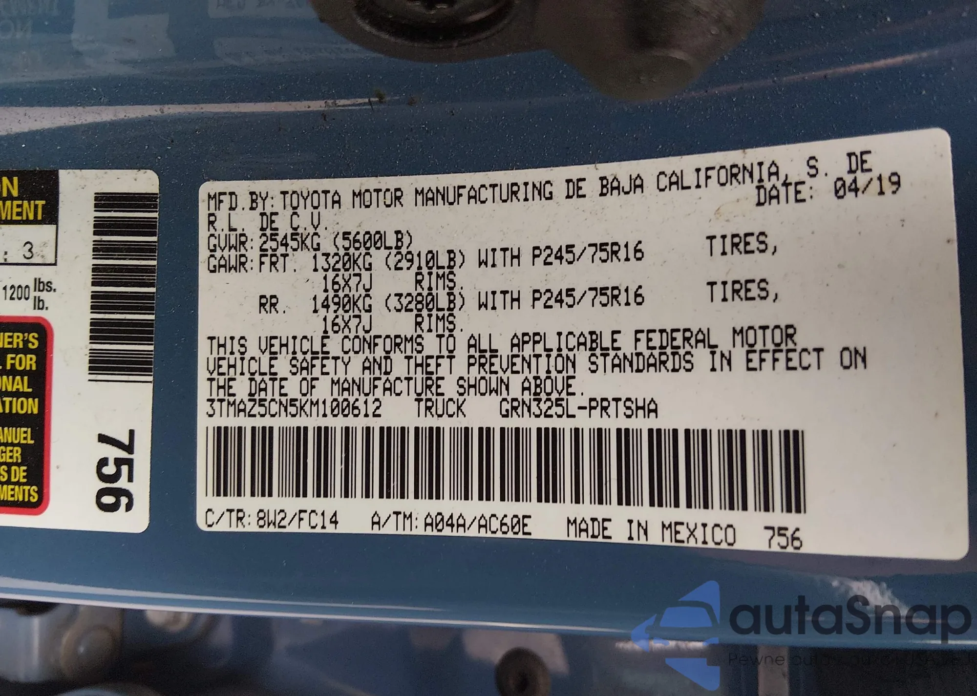 • VIN 3TMAZ5CN5KM100612