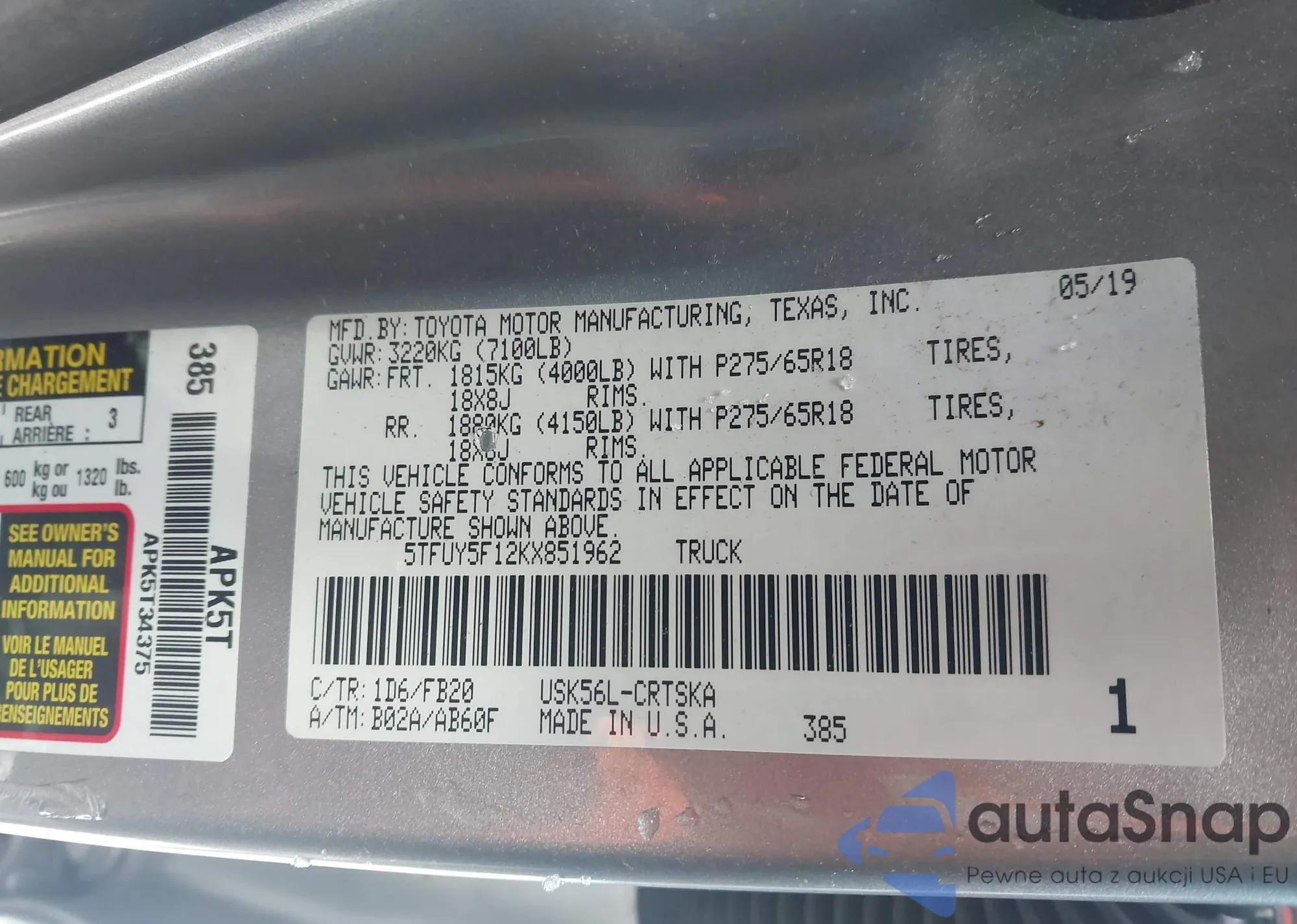 • VIN 5TFUY5F12KX851962