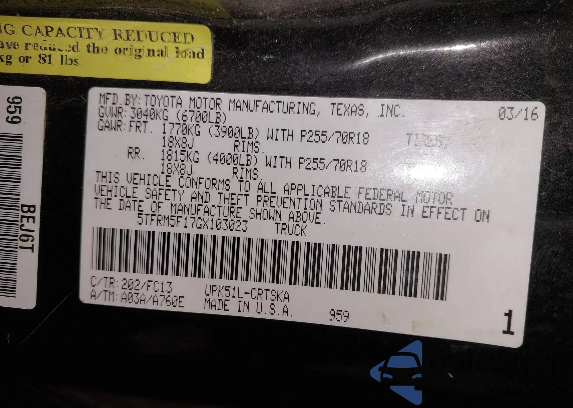 • VIN 5TFRM5F16AX003602