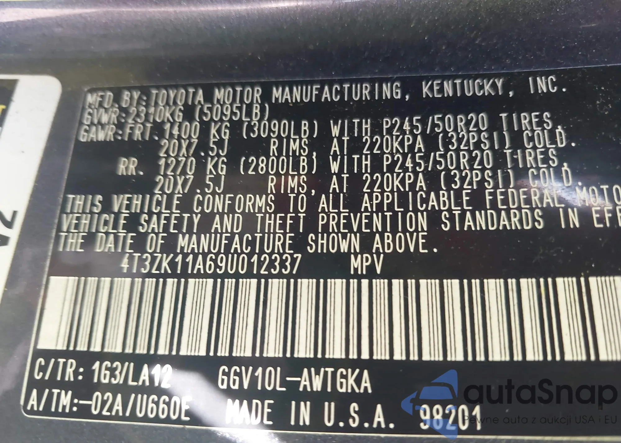 • VIN 4T3ZK11A69U012337