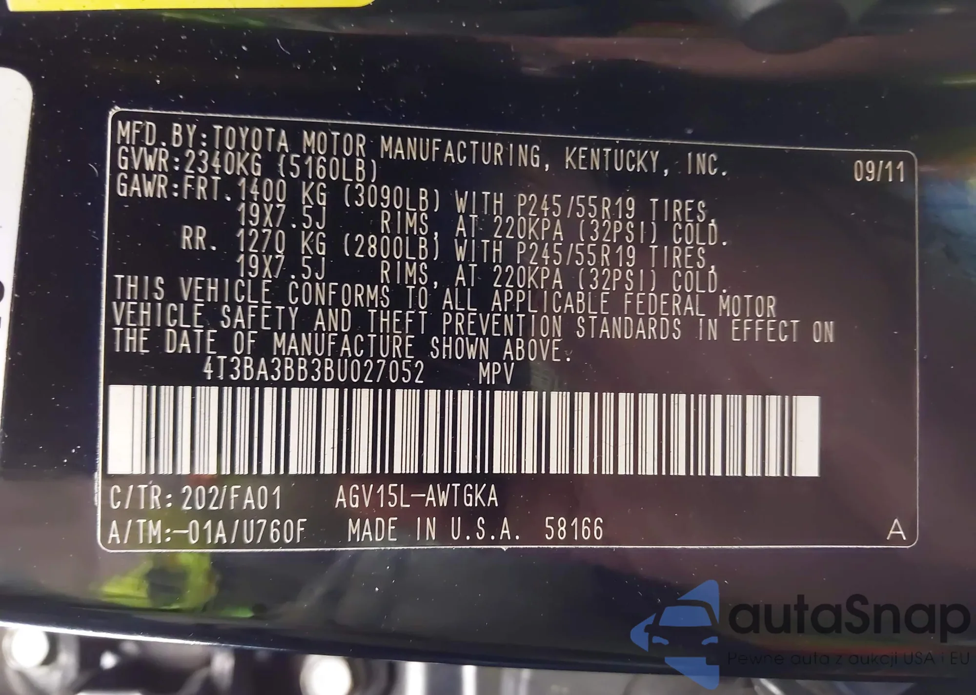 LOT: 43321001 VIN: 4T3ZA3BB3AU025511