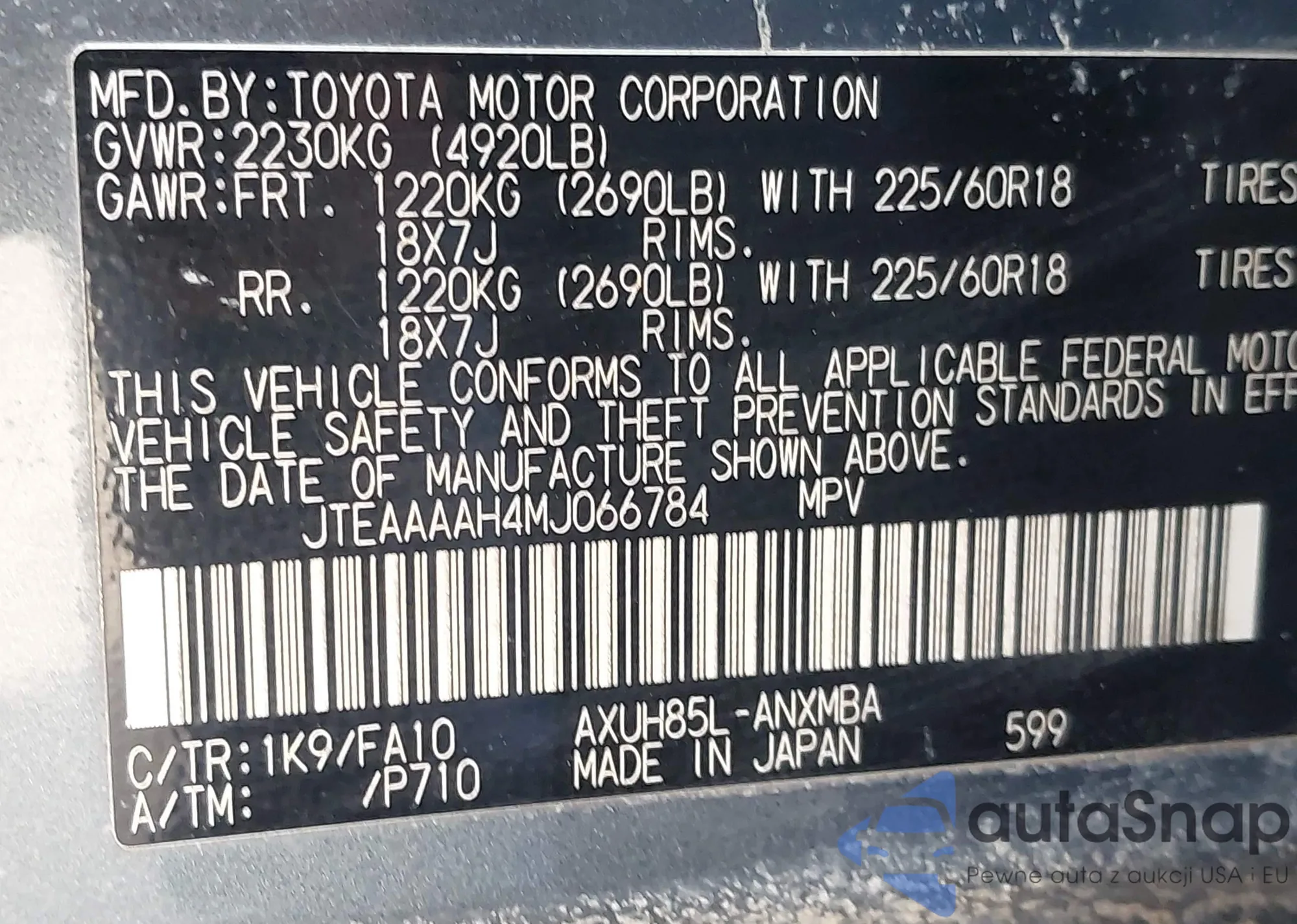 LOT: 44302345 VIN: JTEAAAAH4MJ066784