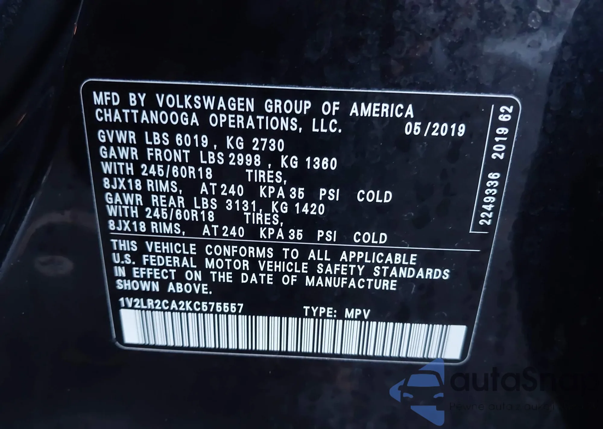 LOT: 43726833 VIN: 1V2LR2CA2KC575557