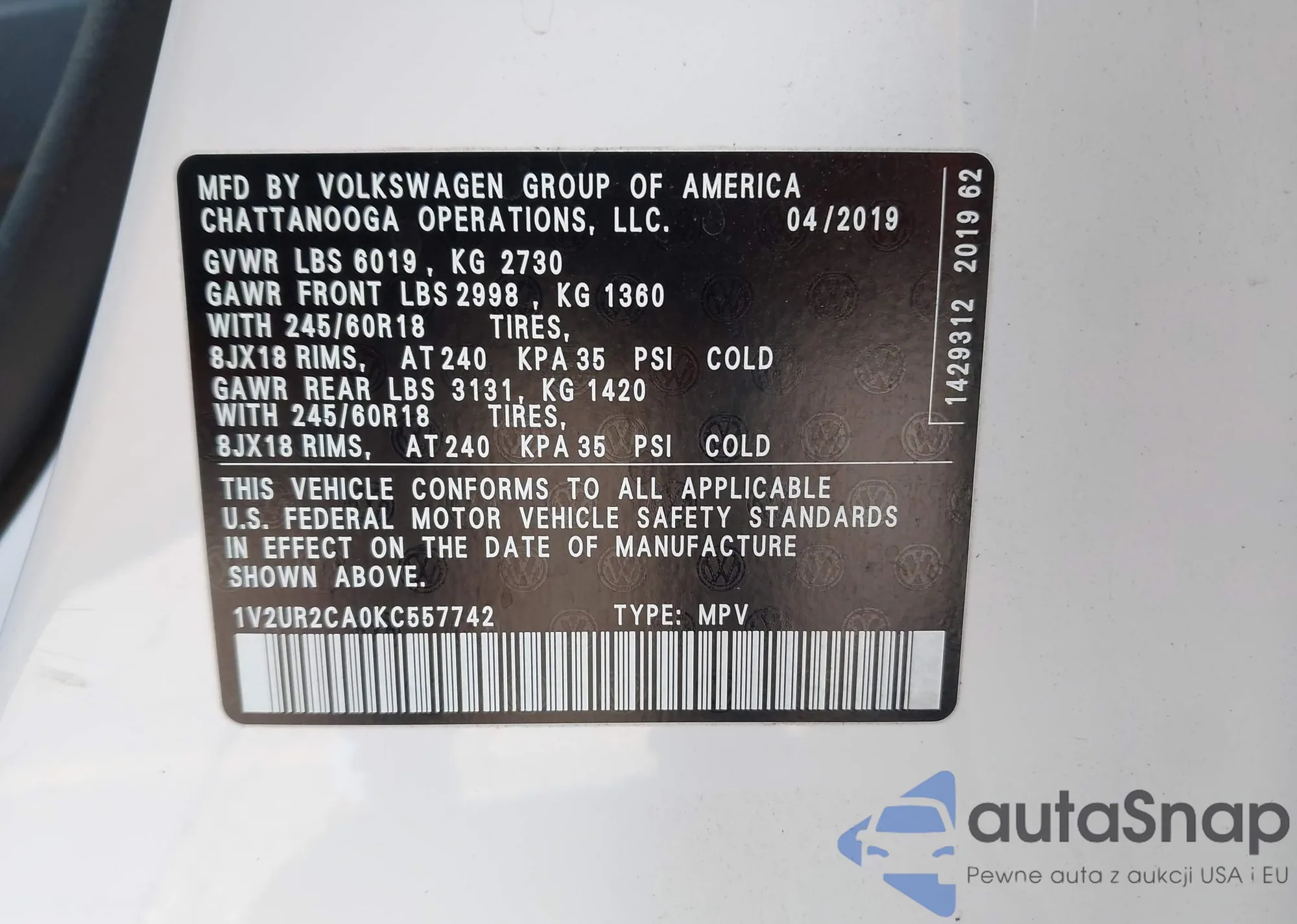 LOT: 44281453 VIN: 1V2ER2CA0KC561827