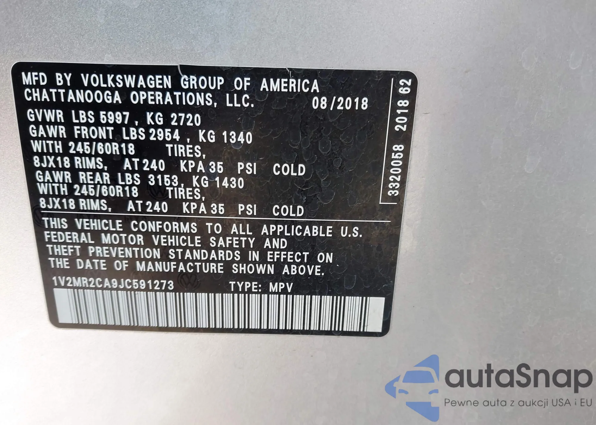 LOT: 43877401 VIN: 1V2MR2CA9JC591273