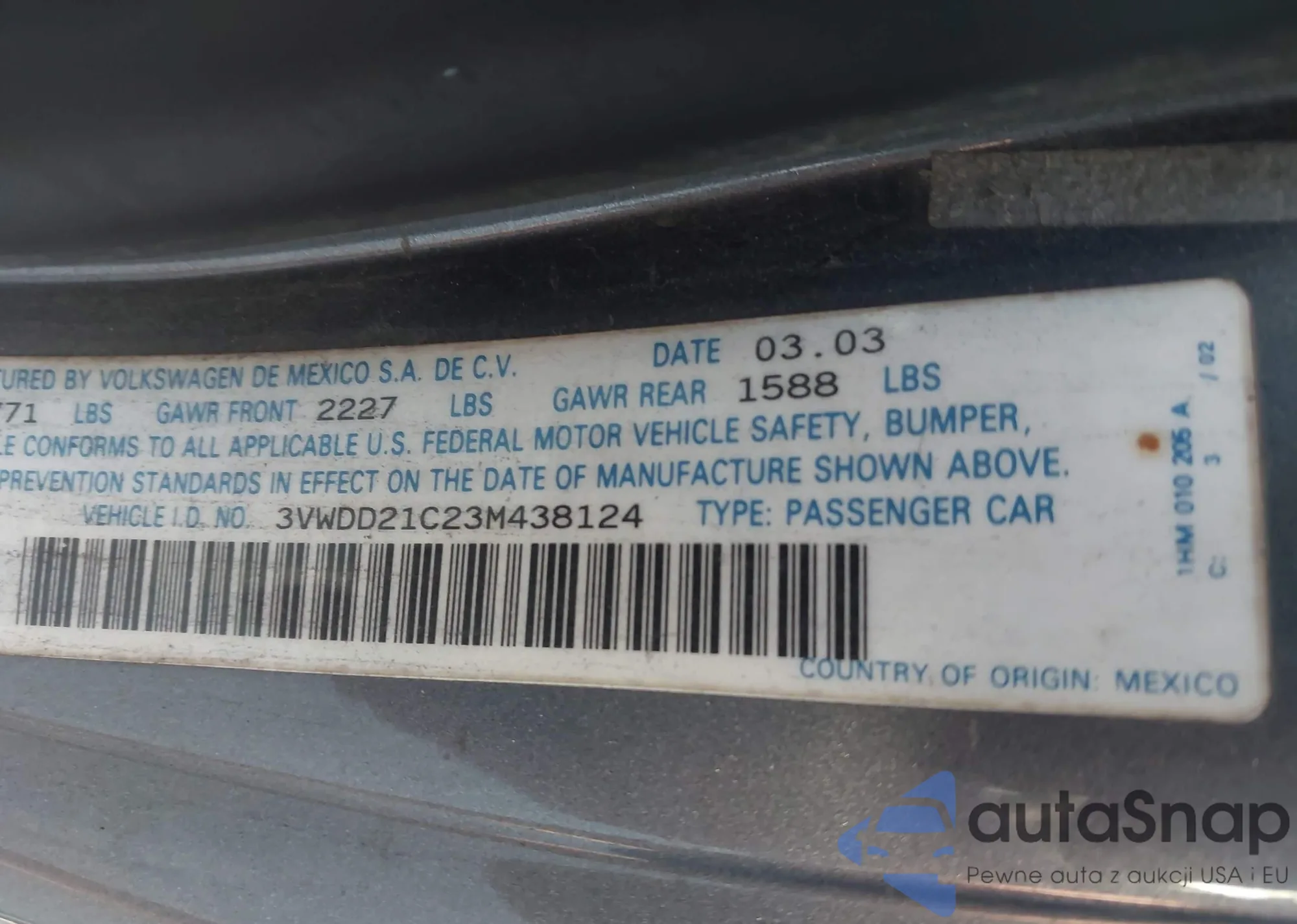 • VIN 3VWDD21C23M438124