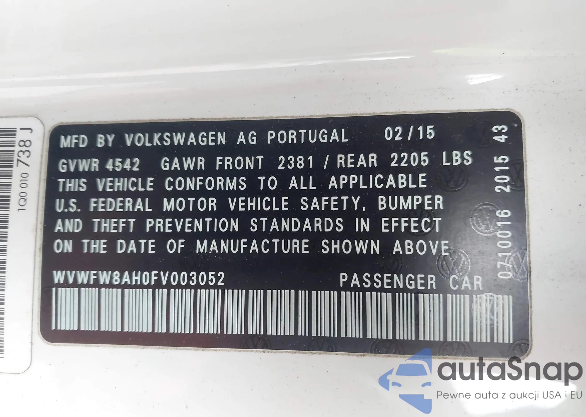 LOT: 43663858 VIN: WVWFW8AH0FV003052
