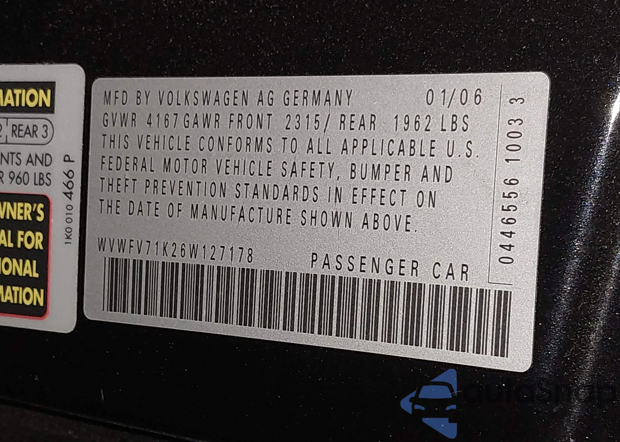 LOT: 44301288 VIN: WVWFV71K26W127178