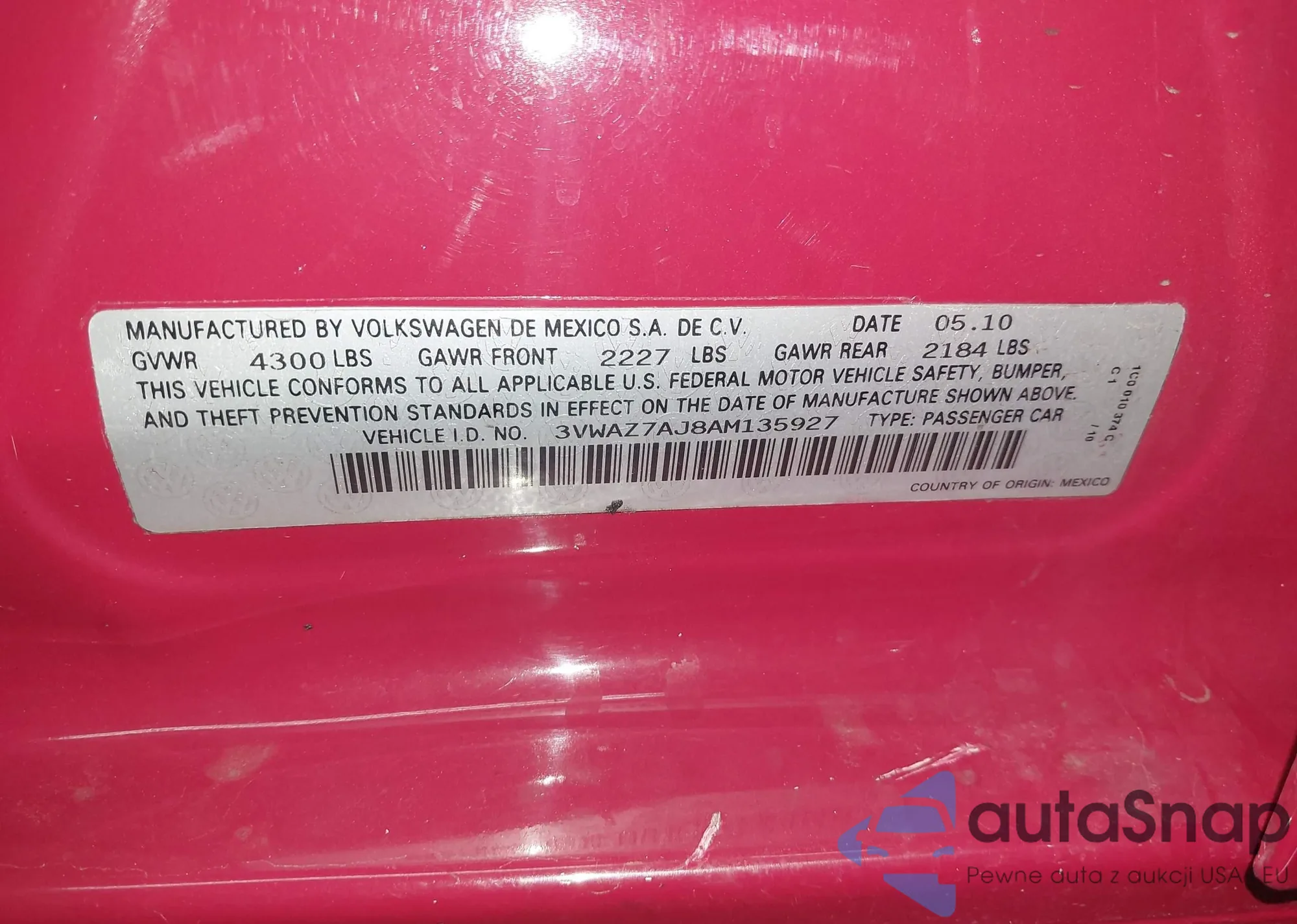 • VIN 3VWAZ7AJ8AM135927