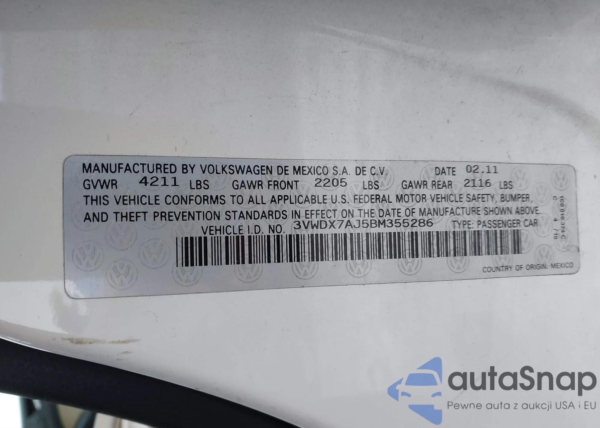 • VIN 3VWDX7AJ5BM355286