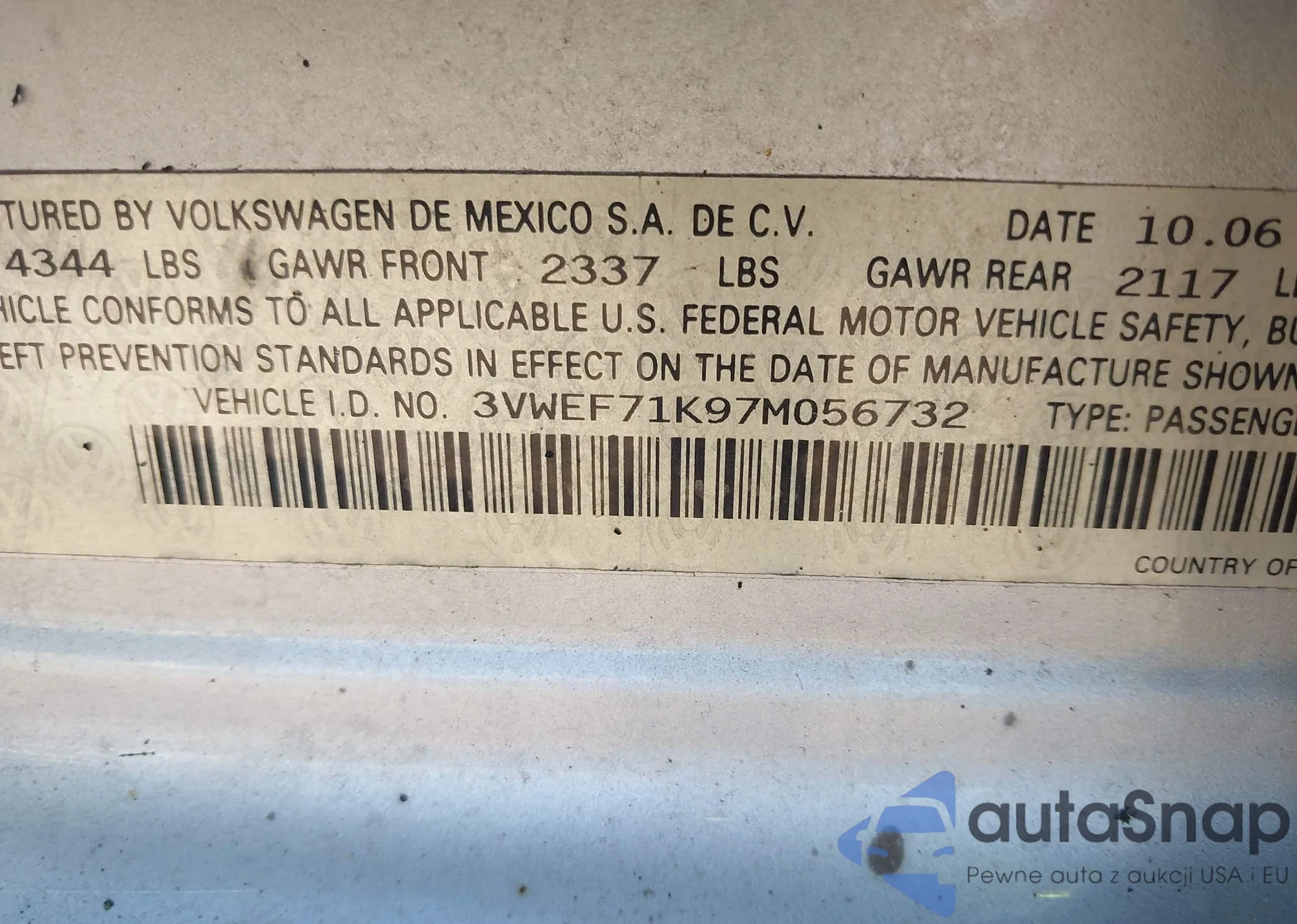 LOT: 44611018 VIN: 3VWEF71K97M056732