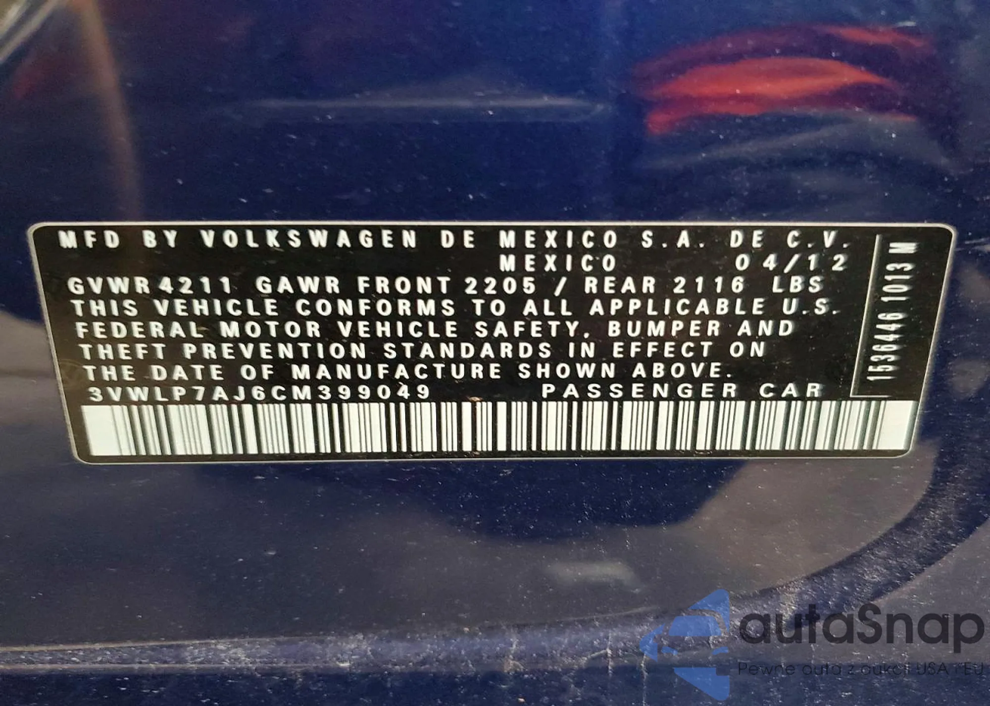 • VIN 3VWLP7AJ6CM399049