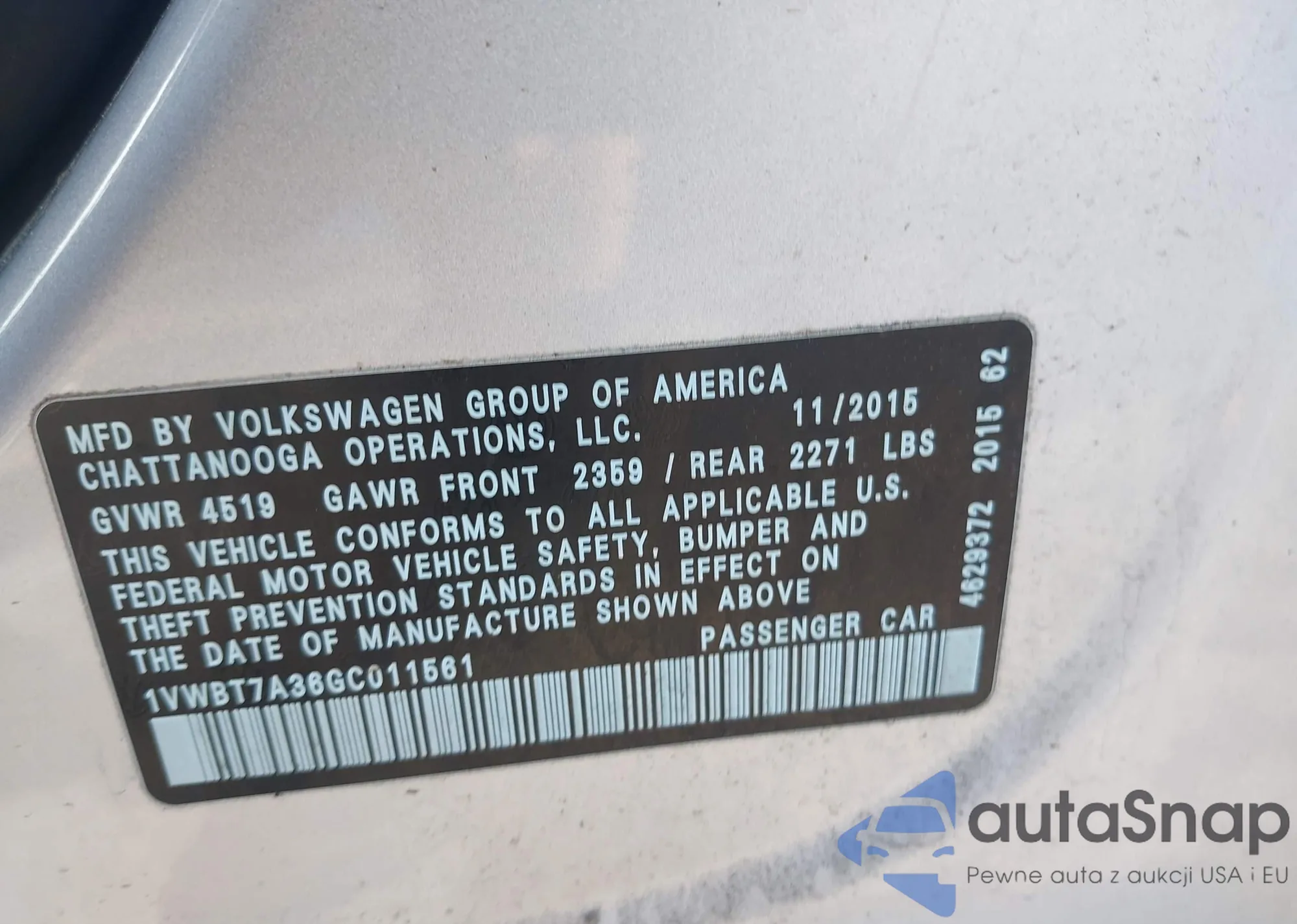 LOT: 44572344 VIN: 1VWBT7A36GC011561