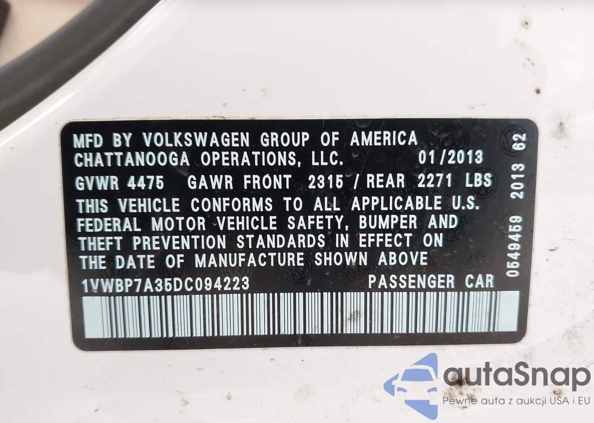 • VIN 1VWBP7A35DC094223