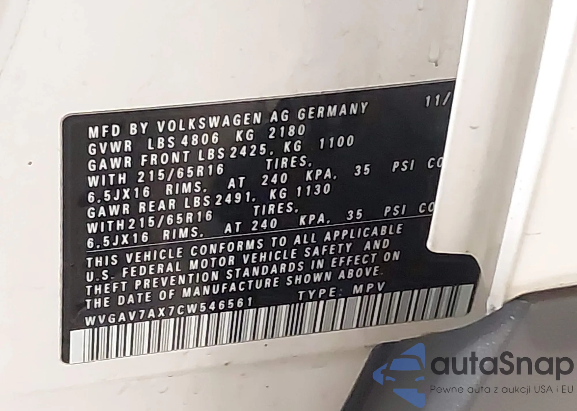 • VIN WVGAV7AX7CW546561