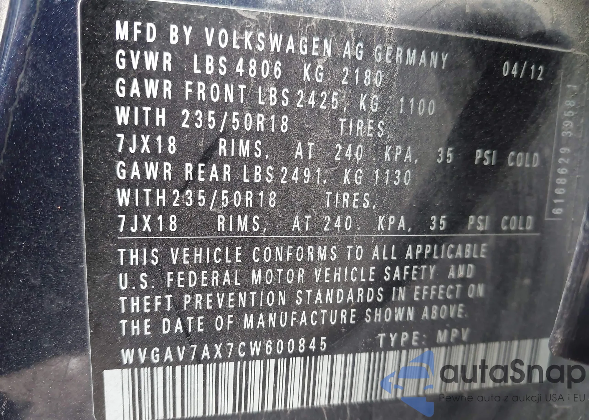 • VIN WVGAV7AX7CW600845