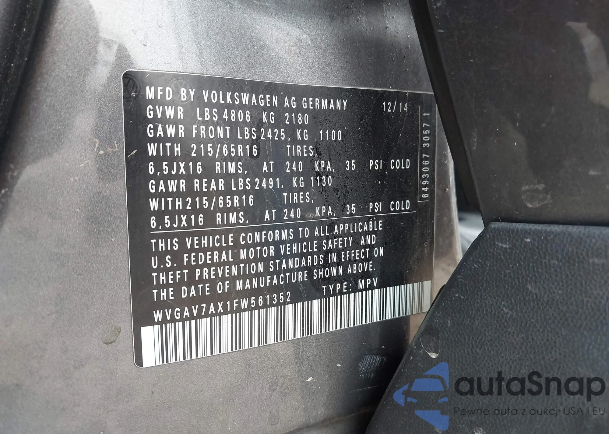 • VIN WVGAV7AX1FW561352