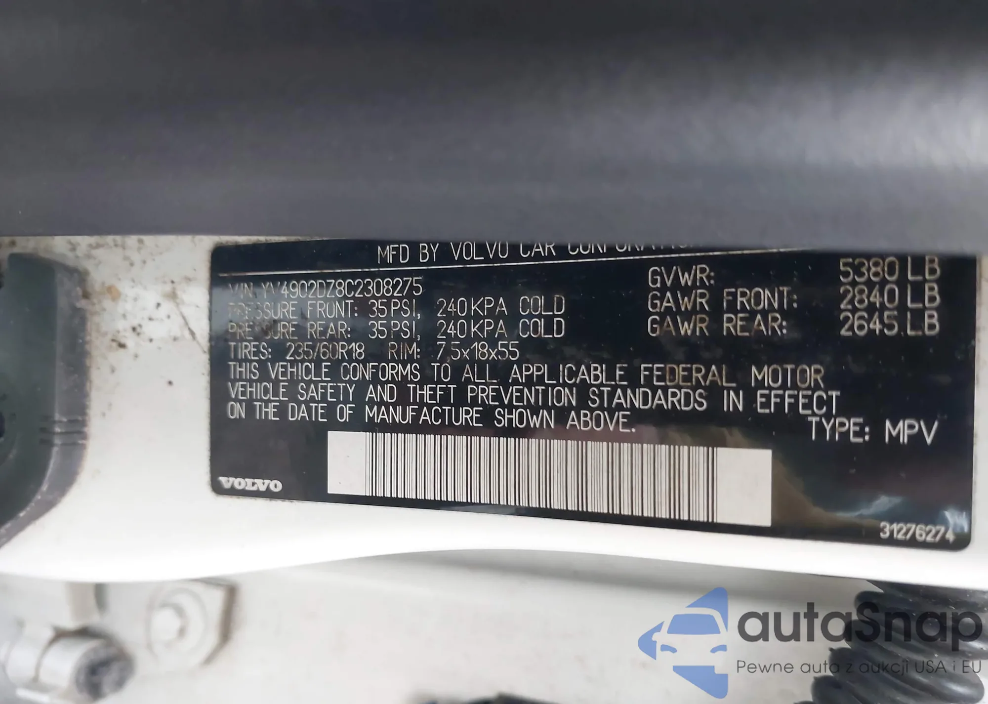 LOT: 43757891 VIN: YV4902DZ8C2308275