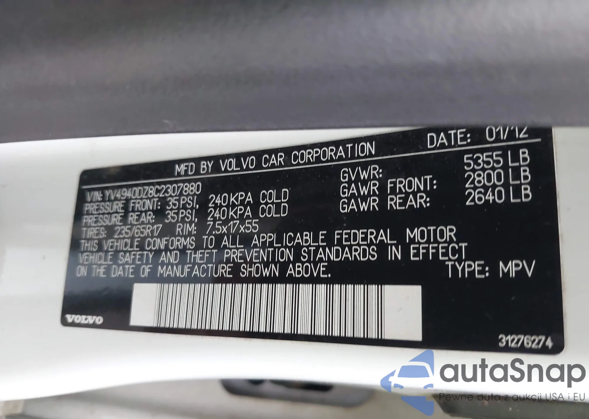 LOT: 44304512 VIN: YV4940DZ8C2307880
