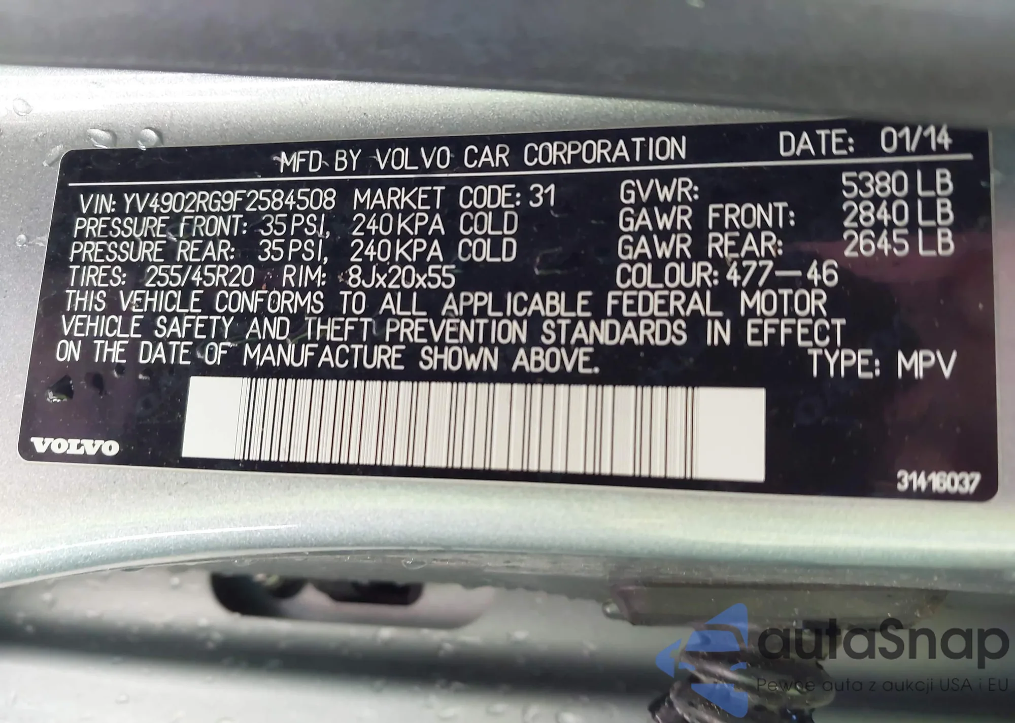 LOT: 43996350 VIN: YV4902RG9F2584508