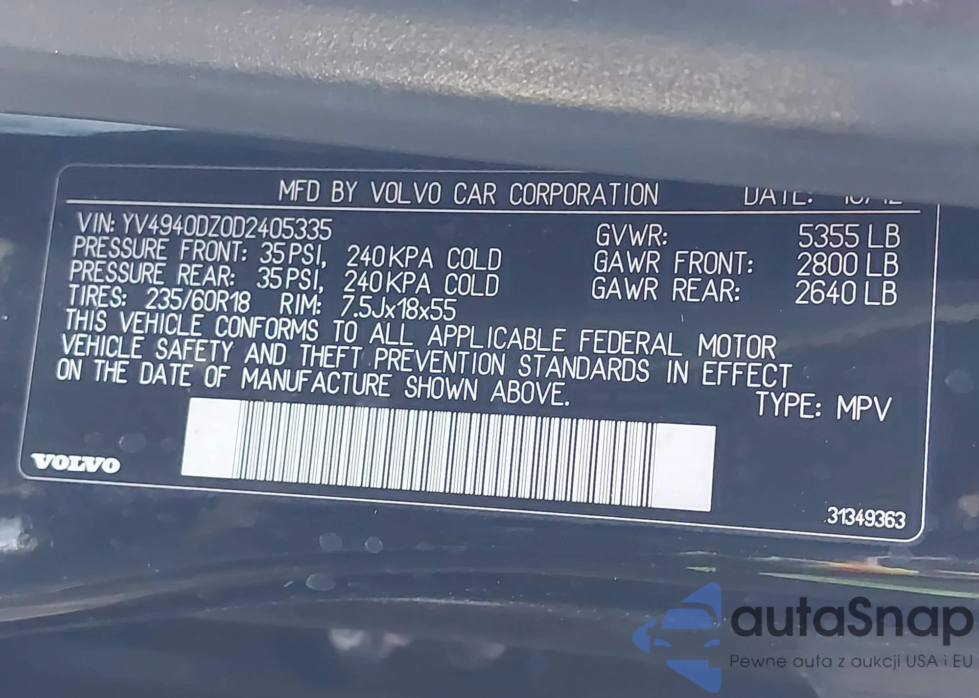 LOT: 43890486 VIN: YV4940DZ0D2405335
