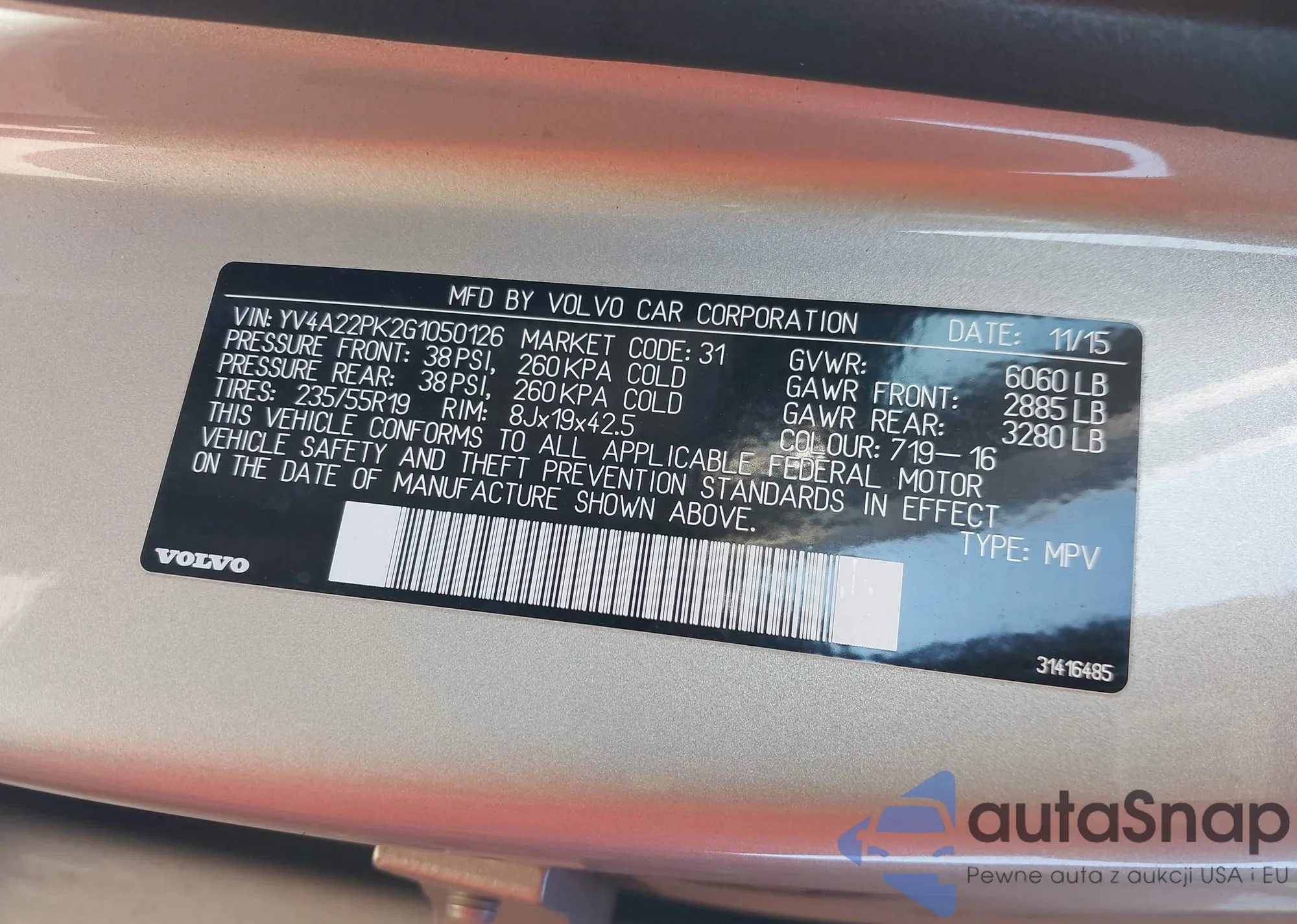 LOT: 44191036 VIN: YV4A22PK2G1050126