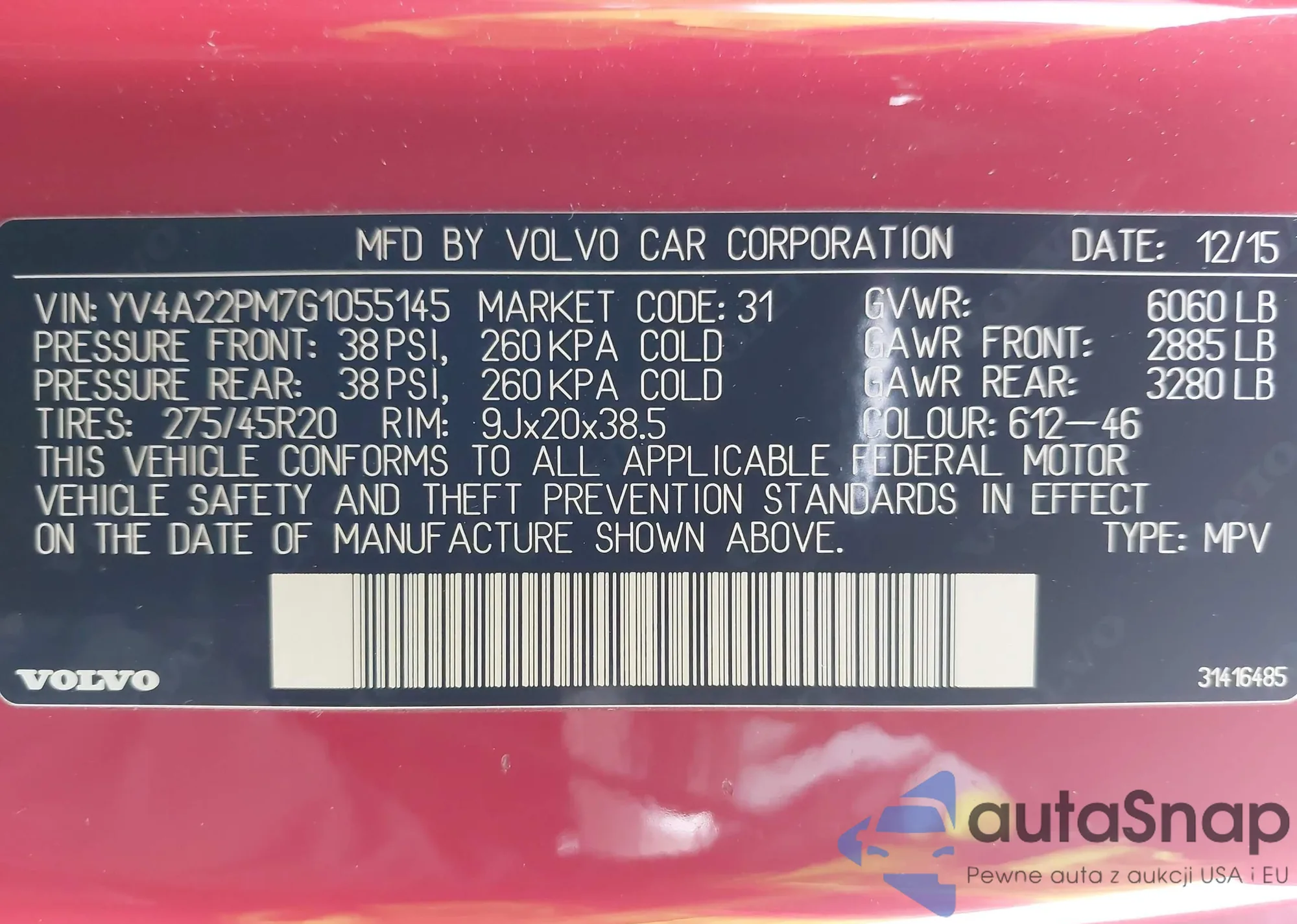 LOT: 44231225 VIN: YV4A22PM7G1055145