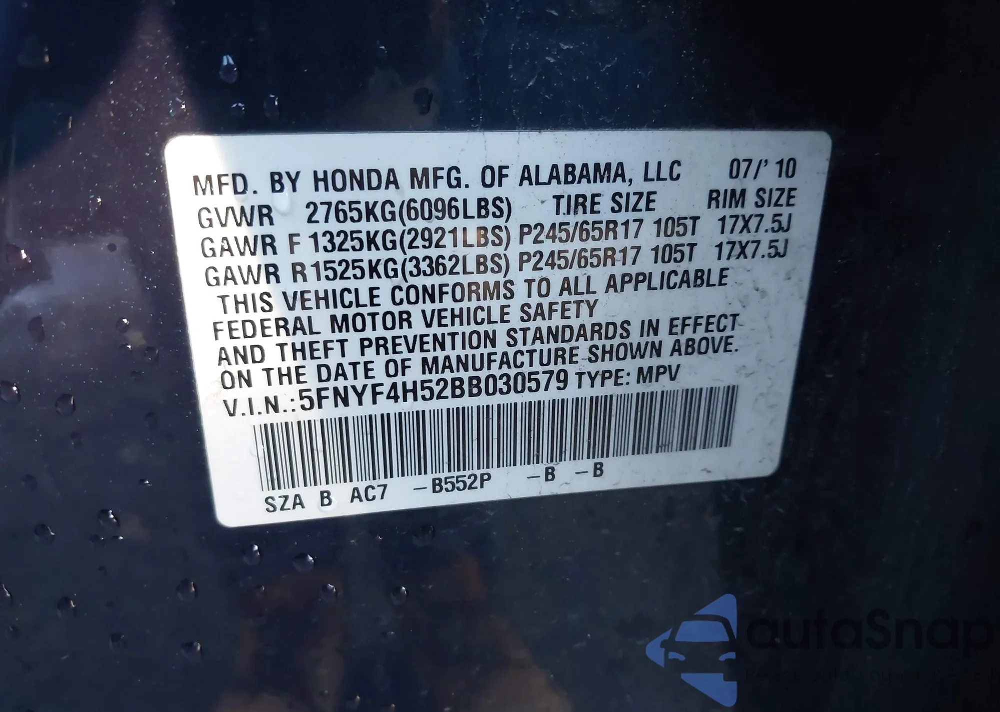 • VIN 2HGFA55517H710458