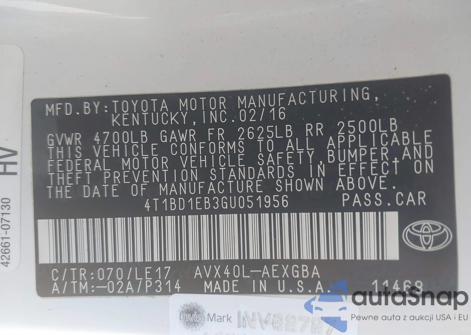 LOT: 41170060 VIN: 4T1BD1EB3GU051956