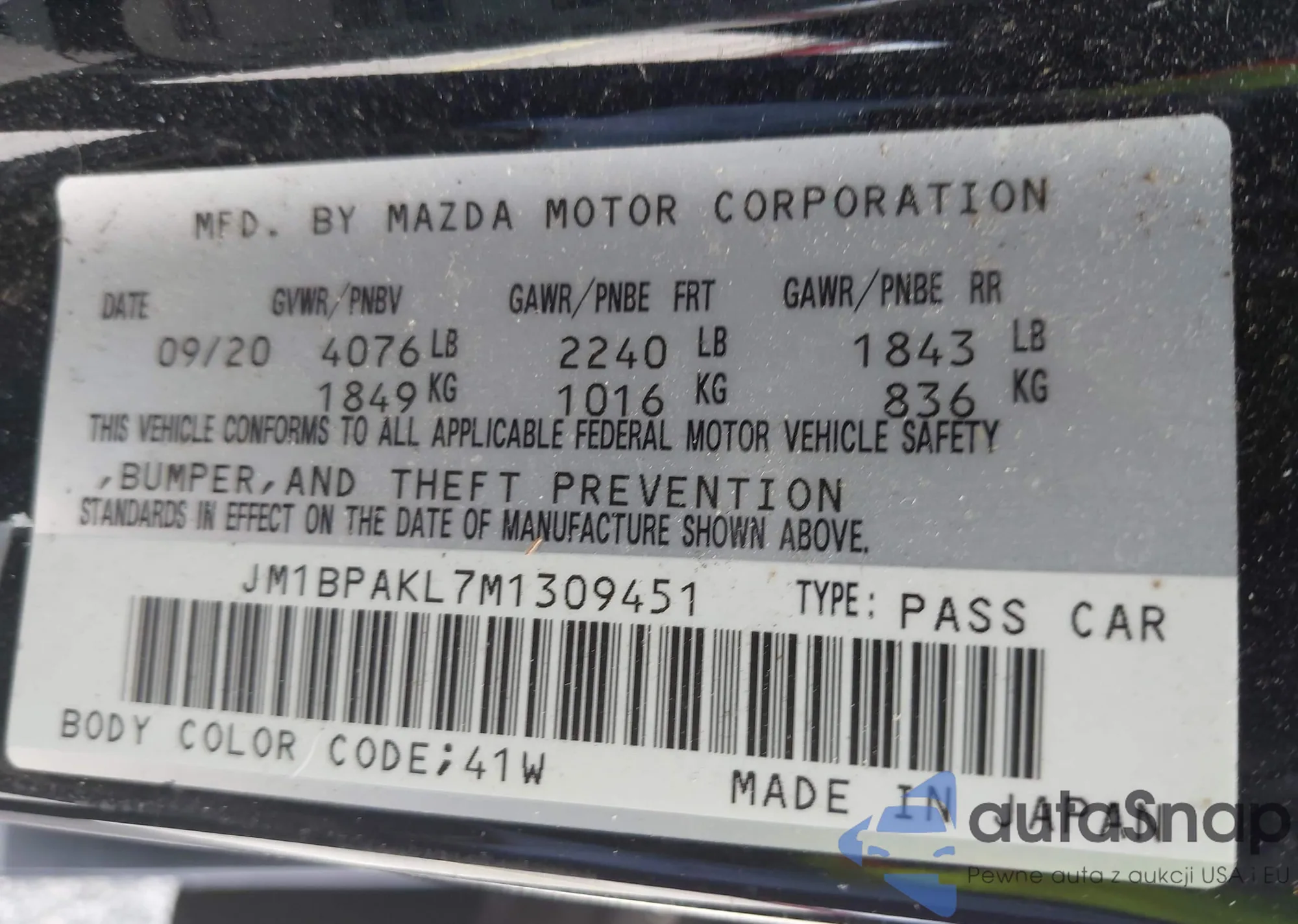 LOT: 41224647 VIN: JM1BPAKL7M1309451