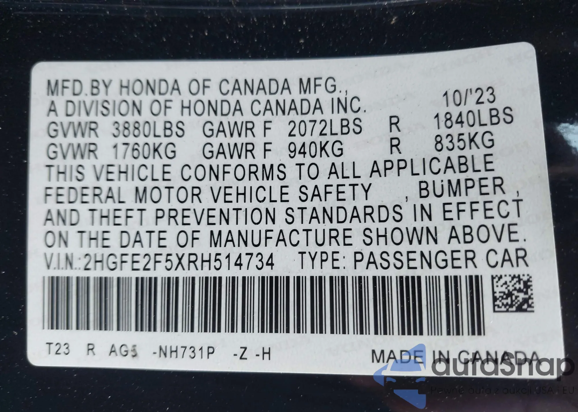 • VIN 2HGFE2F5XRH514734