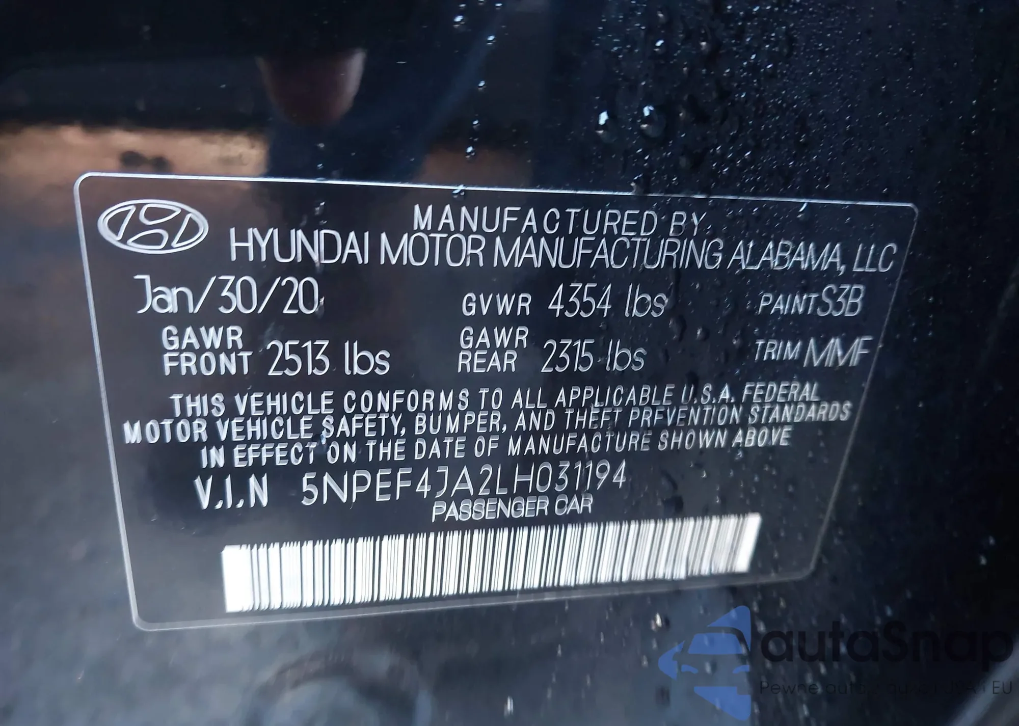 • VIN 5NPEF4JA2LH031194