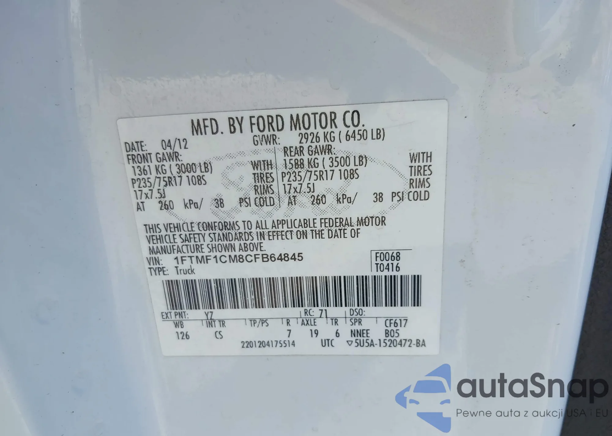 LOT: 40945573 VIN: 1FTMF1CM8CFB64845