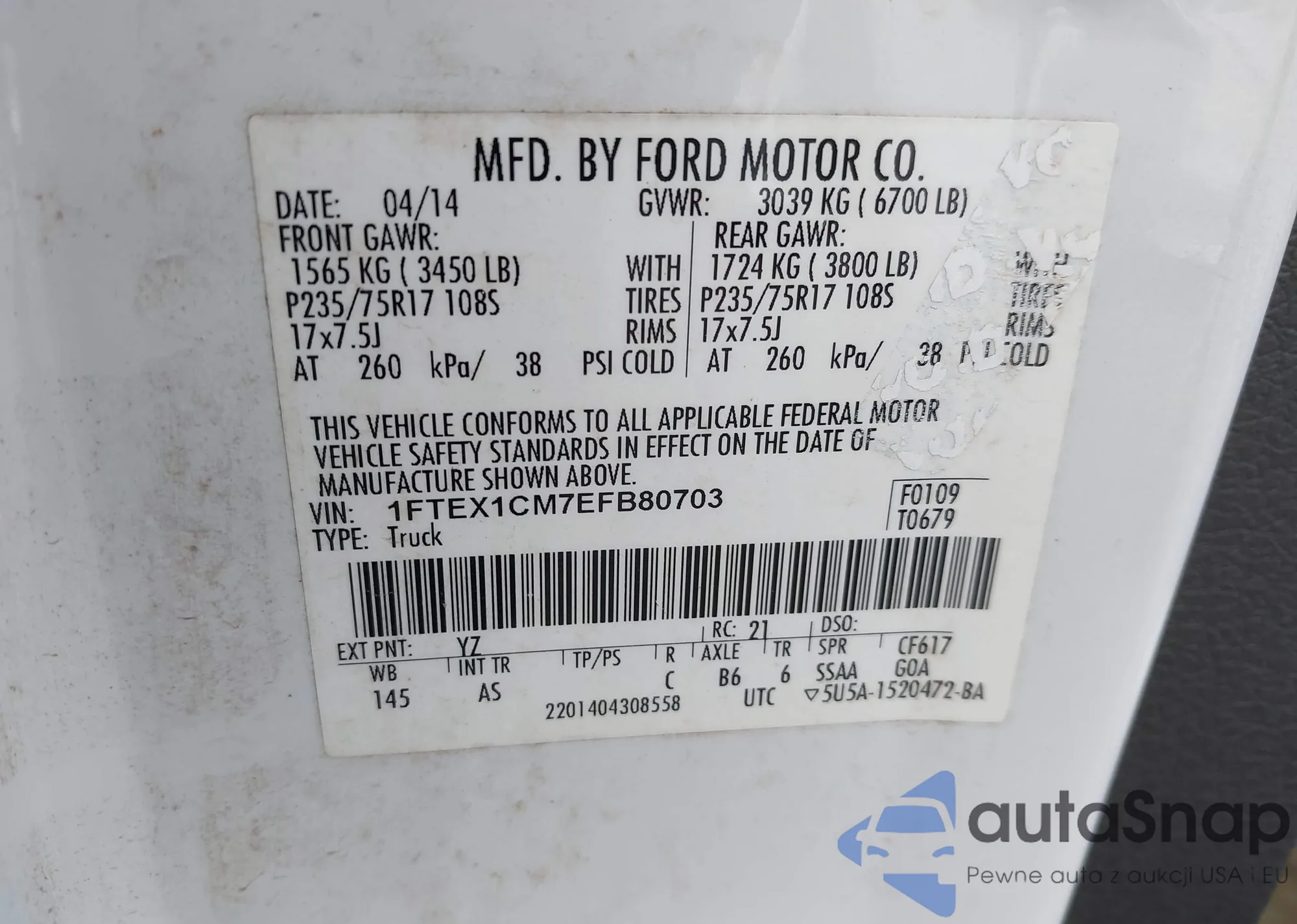 LOT: 40978606 VIN: 1FTEX1CM7EFB80703