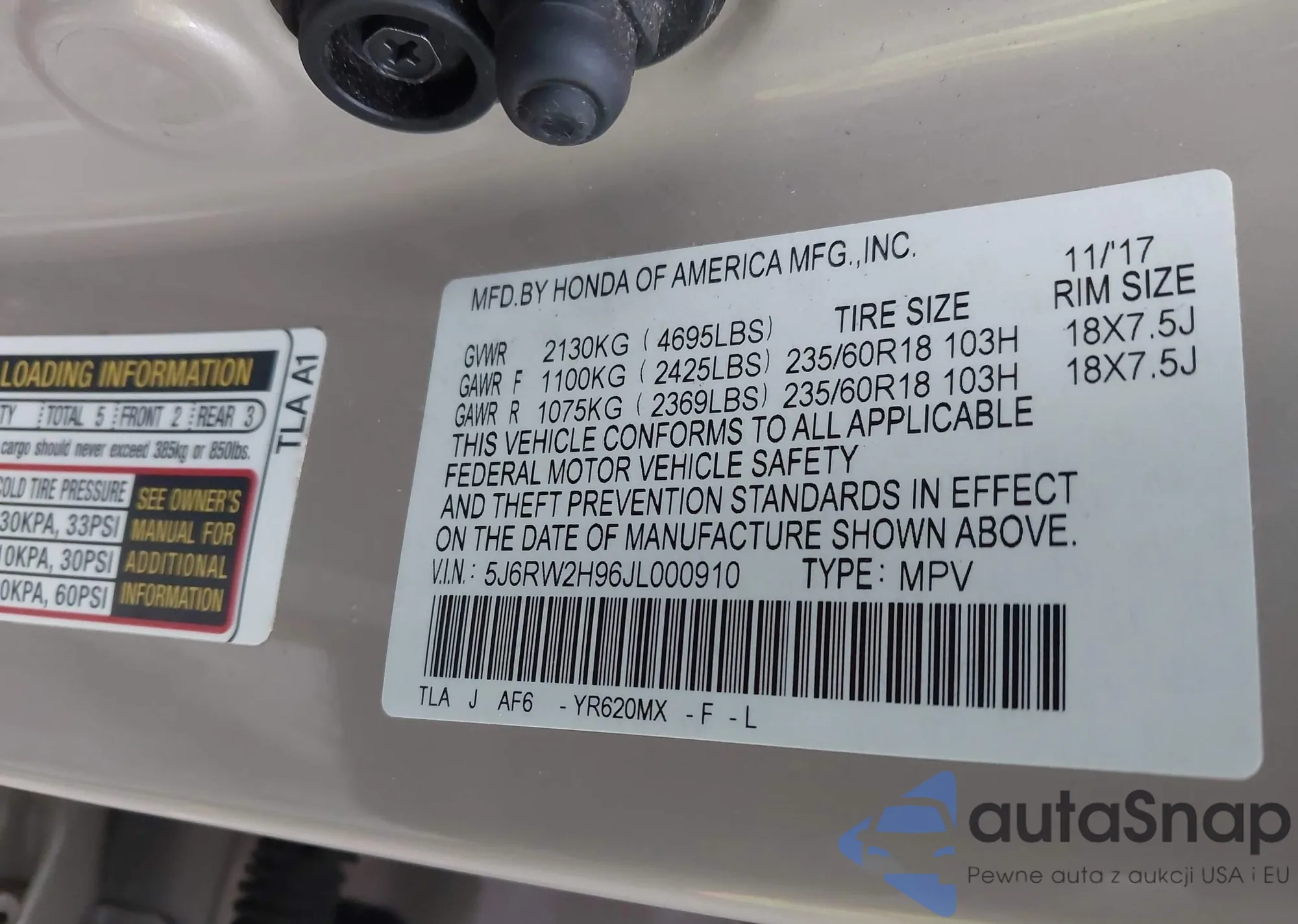 • VIN 5J6RW2H96JL000910