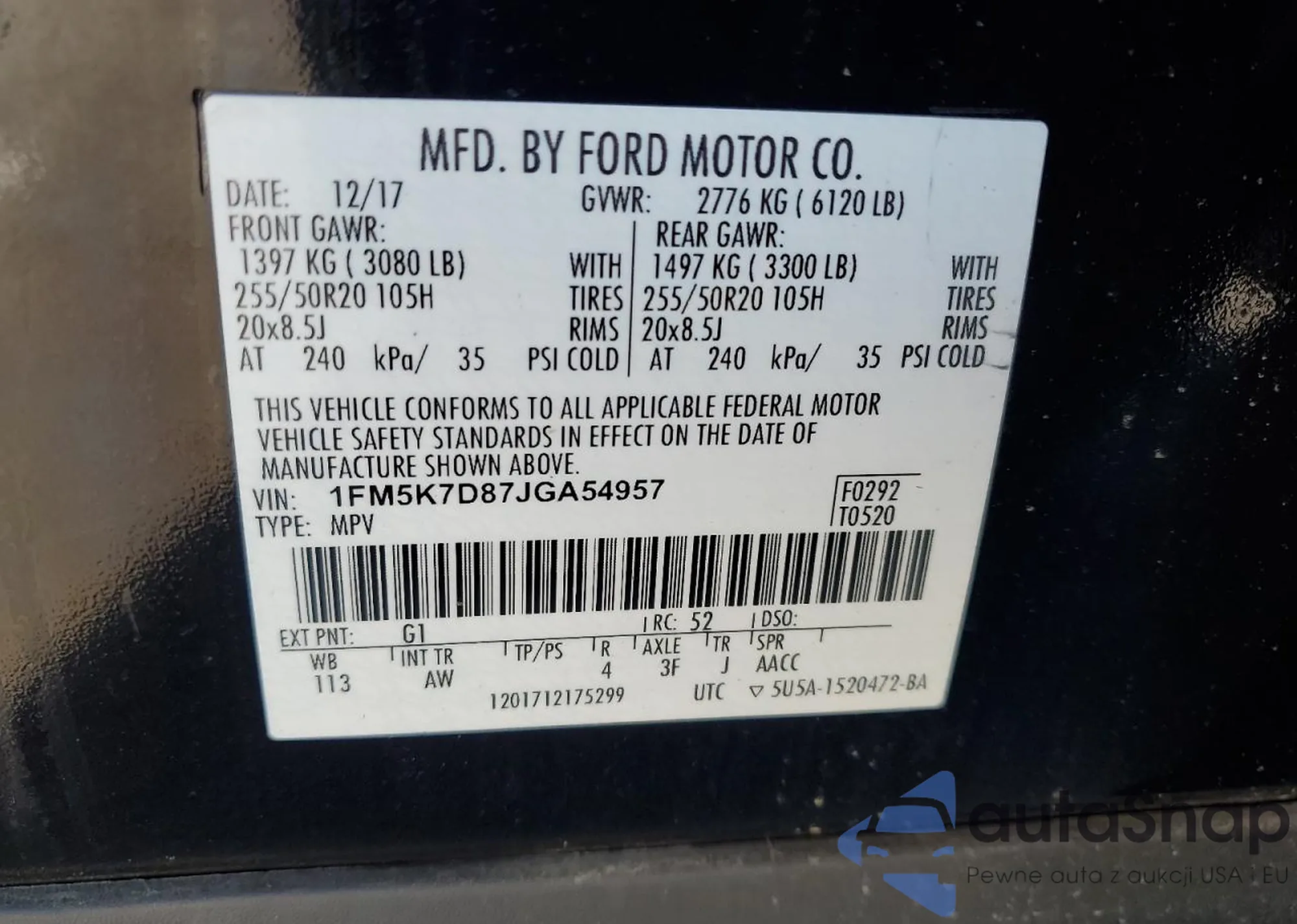 LOT: 83555914 VIN: 1FM5K7D87JGA54957